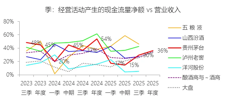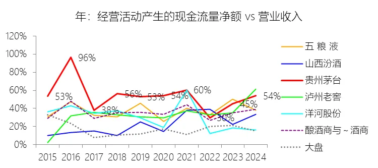 经营活动产生的现金流量净额:2025年,贵州茅台的经营活动产生的现金流量净额为615.22亿元,同比减少33.46%,与营业收入的比例为36.44%,同比下降17.67个百分点;2015-2024年(十年),此项合计为4750.90亿元,平均比例为50.94%,比酿酒商与葡萄酒商行业的均值高15.27个百分点,长期呈下降趋势。比例短期下降主要由于公司控股子公司贵州茅台集团财务有限公司在2025年吸收的集团公司成员单位存款减少,以及不可随时支取的同业定期存款增加,直接限制了当期经营性现金流入的增量;同时,2025年酱香系列酒产品结构调整导致营业收入微降,且支付的各项税费占比同比上升,共同导致现金流净额与营收比例的阶段性回落。比例长期下降主要由于公司在过去十年间营业收入增长了423.27%,年复合增长率高达20.19%,极大的营收基数扩张使得现金流比例在统计上随规模效益的释放而自然摊薄;此外,公司支付的各项税费占营收比例长期呈上升趋势(十年平均比例为44.87%),且受集团内部股权划转(如2022年习酒划出后不再是财务公司成员单位)等结构性因素干扰,使得经营性现金流在部分年份出现较大幅度波动,从而在长期趋势中呈现比例下降的特征。比例高于酿酒商与葡萄酒商行业的均值主要由于公司拥有环境、工艺、品质、品牌及文化构成的五大核心竞争力,形成了全球烈性酒第一品牌的极强议价能力和产品稀缺性,使其十年平均销售费用率仅为3.31%,大幅低于行业水平;同时,公司凭借“先款后货”的强势销售模式持续获得大额合同负债,并依托具有金融牌照职能的集团财务公司对集团内资金进行高效归集,使其现金回笼效率和经营造血能力显著优于缺乏品牌支撑和金融运作规模的行业同行。