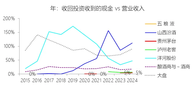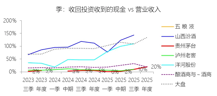收回投资收到的现金:2025年,贵州茅台的收回投资收到的现金为334.55亿元,同比增长291.29%,与营业收入的比例为19.81%,同比上升14.81个百分点;2015-2024年(十年),此项合计为164.81亿元,平均比例为1.77%,比酿酒商与葡萄酒商行业的均值低18.2个百分点,长期呈上升趋势。