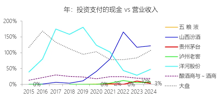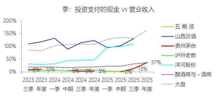 投资支付的现金:2025年,贵州茅台的投资支付的现金为620.97亿元,同比增长980.86%,与营业收入的比例为36.78%,同比上升33.42个百分点;2015-2024年(十年),此项合计为229.68亿元,平均比例为2.46%,比酿酒商与葡萄酒商行业的均值低19.11个百分点,长期呈上升趋势。