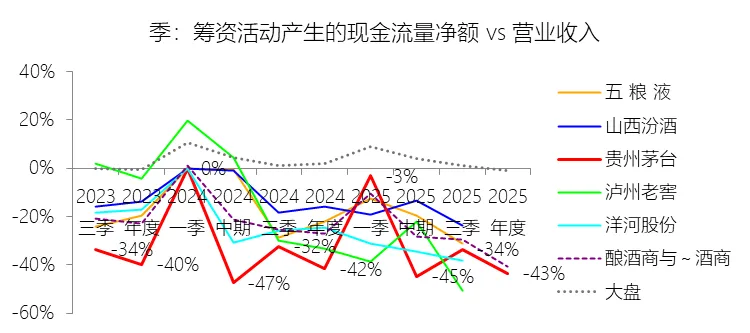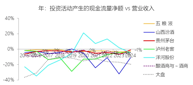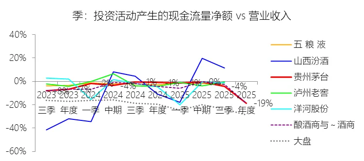 投资活动产生的现金流量净额:2025年,贵州茅台的投资活动产生的现金流量净额为-316.42亿元,绝对值同比增长1672.45%,与营业收入的比例为-18.74%,同比下降17.7个百分点;2015-2024年(十年),此项合计为-334.81亿元,平均比例为-3.59%,比酿酒商与葡萄酒商行业的均值高1.61个百分点,长期呈上升趋势。比例短期下降主要由于公司控股子公司贵州茅台集团财务有限公司在2025年大幅增加了同业存单等金融工具的投资支付,导致投资支付的现金同比猛增980.86%至620.97亿元,在营业收入因产品结构调整微降1.21%的背景下,投资活动现金流出的巨幅扩张直接导致了该比例的深度回落。比例长期上升主要由于公司在过去十年间营业收入实现了超过 400% 的显著扩张,年复合增长率高达 20.19%,庞大的营收基数对投资性现金流出产生了显著的摊薄作用;同时,随着公司资金运作模式的成熟,前期通过财务公司开展的大规模金融投资进入滚动回收期,收回投资收到的现金占营收比例整体呈上升趋势,加之营收增速在长期尺度上覆盖了基建类资本开支的增速,推动了净流出比例向 0 回升。比例高于酿酒商与葡萄酒商行业的均值直接受益于公司滚动收回的前期金融投资,这反映的是其卓越的现金管理效率和财务运作模式。收回投资为高分红和回购提供了充足的现金头寸,支撑这些回报的根本动力依然是公司强大的经营活动造血能力(2025 年经营性现金流达 615.22 亿元)以及领先行业的营收规模。