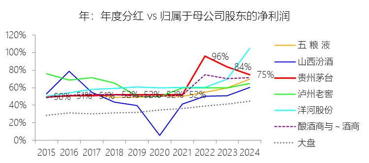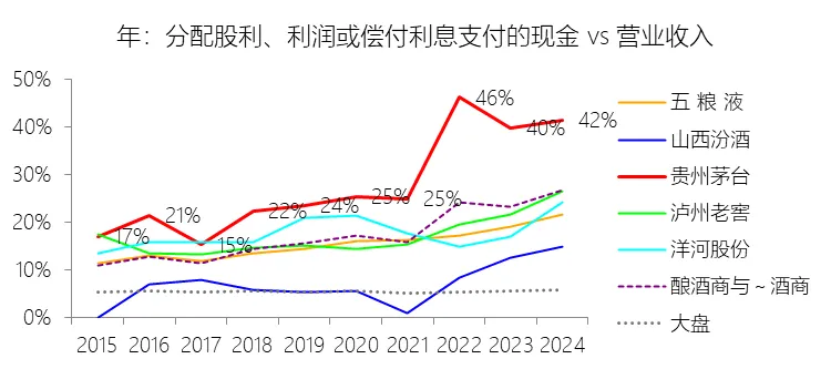 分配股利、利润或偿付利息支付的现金:2025年,贵州茅台的分配股利、利润或偿付利息支付的现金为672.42亿元,同比减少5.23%,与营业收入的比例为39.83%,同比下降1.69个百分点;2015-2024年(十年),此项合计为2970.11亿元,平均比例为31.85%,比酿酒商与葡萄酒商行业的均值高12.65个百分点,长期呈上升趋势。