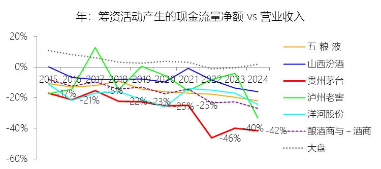 筹资活动产生的现金流量净额:2025年,贵州茅台的筹资活动产生的现金流量净额为-734.27亿元,绝对值同比增长3.32%,与营业收入的比例为-43.49%,同比下降1.91个百分点;2015-2024年(十年),此项合计为-2966.20亿元,平均比例为-31.81%,比酿酒商与葡萄酒商行业的均值低13.41个百分点,长期呈下降趋势。比例短期下降主要由于公司在2025年加大了对股东的回报力度,除了持续维持高规模的现金分红外(当期分配股利、利润或偿付利息支付的现金为672.42亿元),还实施了较大规模的股份回购,2025年回购股票支付的金额高达61.21亿元;在营业收入因酱香系列酒产品结构调整微降1.21%的背景下,分红与回购带来的筹资活动现金流出保持高位,导致其占营收的负值比例进一步扩大。比例长期下降主要由于公司在过去十年间利润持续高增长的同时,建立了极具竞争力的现金分红机制,其十年平均分红率达67.33%,且近年来分红比例显著提升(如2024年分红率达75%)并多次实施特别分红;随着公司分红规模的持续扩张,筹资性现金流出的增速在多个阶段优于营收增速,推动了该比例在长期趋势中向负值深处延伸。比例低于酿酒商与葡萄酒商行业的均值主要由于公司拥有全球酒业最强的经营造血能力和极度稳健的资本结构,在资产扩张与业务发展中完全依靠内生资金,多年来始终保持无任何外部银行借款或债券融资的“零借款”状态;相比之下,多数行业同行仍存在一定的债务融资需求以补充流动性,而茅台的筹资活动基本呈现“纯流出”特征(仅体现为巨额分红和回购),这种缺乏筹资流入且分红力度远超同行的财务表现,使其筹资活动现金流量净额占营收的比例显著低于缺乏品牌溢价及充沛现金支撑的行业平均水平。