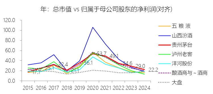 市盈率:2025年,贵州茅台的归属于母公司股东的净利润(对齐)为823.20亿元,对比年初减少4.53%,总市值与归属于母公司股东的净利润(对齐)的比例为20.9倍(市盈率),对比年初下降1.25个倍数;2015-2024年(十年),此项合计为4585.48亿元,平均比例为33.0倍,比酿酒商与葡萄酒商行业的均值高1.27个倍数,长期呈上升趋势。