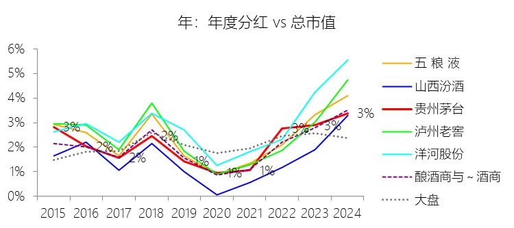 股息率:2024年,贵州茅台的股息率为3.38%,同比上升0.48个百分点;2015-2024年(十年),平均股息率为2.04%,比酿酒商与葡萄酒商行业的均值高0.11个百分点,长期呈上升趋势。