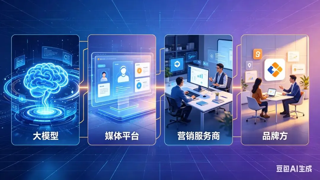 AI营销的竞争,将从单点的工具应用,转向全链路的生态构建。未来的AI营销,不再是简单的“大模型+营销场景”,而是形成大模型厂商、媒体平台、营销服务商、品牌方协同发展的全新生态。