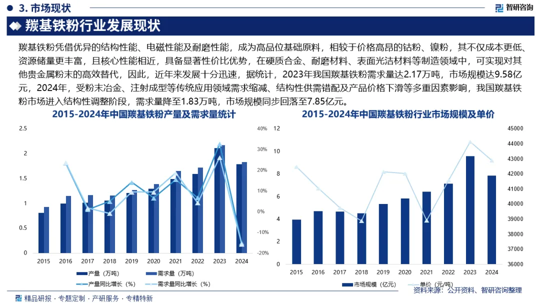 羰基铁粉是以海绵铁、一氧化碳为主要原材料合成羰基铁,用羰基络合物热分解工艺技术生产的微米级、亚微米级单质元素纯铁粉,是一种多功能超细金属粉体材料。羰基铁粉凭借优异的结构性能、电磁性能及耐磨性能,成为高品位基础原料,相较于价格高昂的钴粉、镍粉,其不仅成本更低、资源储量更丰富,且核心性能相近,具备显著性价比优势,在硬质合金、耐磨材料、表面光洁材料等制造领域中,可实现对其他贵金属粉末的高效替代,因此,近年来发展十分迅速,据统计,2023年我国羰基铁粉需求量达2.17万吨,市场规模达9.58亿元,2024年,受粉末冶金、注射成型等传统应用领域需求缩减、结构性供需错配及产品价格下滑等多重因素影响,我国羰基铁粉市场进入结构性调整阶段,需求量降至1.83万吨,市场规模同步回落至7.85亿元。