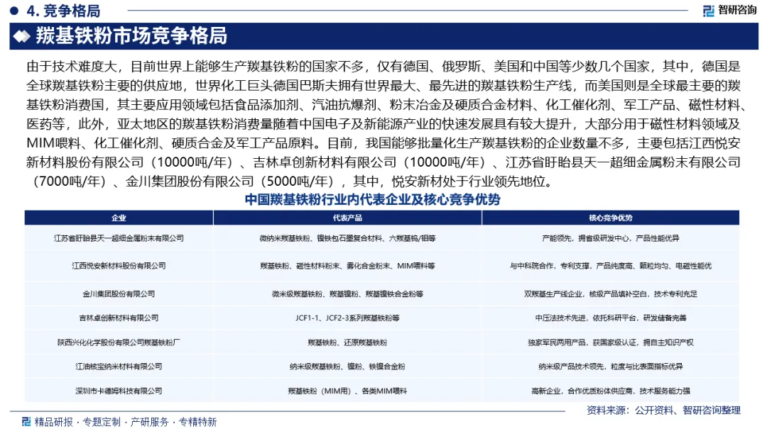 市场竞争格局:目前,我国能够批量化生产羰基铁粉的企业数量不多,主要包括江西悦安新材料股份有限公司(10000吨/年)、吉林卓创新材料有限公司(10000吨/年)、江苏省盱眙县天一超细金属粉末有限公司(7000吨/年)、金川集团股份有限公司(5000吨/年),其中,悦安新材处于行业领先地位。
