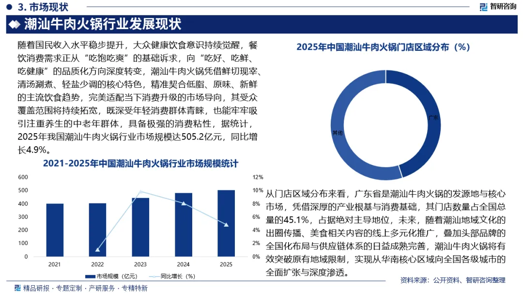 潮汕牛肉火锅是发源于潮州、汕头、揭阳等潮汕地区的特色美食,是以鲜切牛肉为主料,搭配牛骨清汤锅底涮煮的火锅品类,已被列入汕头市级非遗项目。随着国民收入水平稳步提升,大众健康饮食意识持续觉醒,餐饮消费需求正从“吃饱吃爽”的基础诉求,向“吃好、吃鲜、吃健康”的品质化方向深度转变,潮汕牛肉火锅凭借鲜切现宰、清汤涮煮、轻盐少调的核心特色,精准契合低脂、原味、新鲜的主流饮食趋势,完美适配当下消费升级的市场导向,其受众覆盖范围将持续拓宽,既深受年轻消费群体青睐,也能牢牢吸引注重养生的中老年群体,具备极强的消费粘性,据统计,2025年我国潮汕牛肉火锅行业市场规模达505.2亿元,同比增长4.9%。