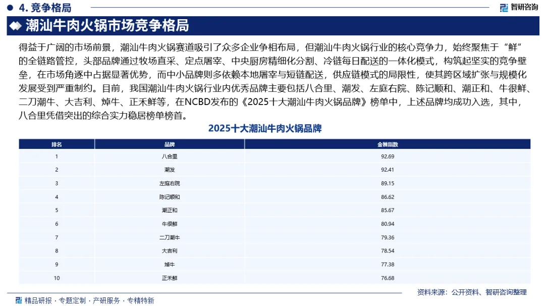 市场竞争格局:得益于广阔的市场前景,潮汕牛肉火锅赛道吸引了众多企业争相布局,但潮汕牛肉火锅行业的核心竞争力,始终聚焦于“鲜”的全链路管控,头部品牌通过牧场直采、定点屠宰、中央厨房精细化分割、冷链每日配送的一体化模式,构筑起坚实的竞争壁垒,在市场角逐中占据显著优势,而中小品牌则多依赖本地屠宰与短链配送,供应链模式的局限性,使其跨区域扩张与规模化发展受到严重制约。目前,我国潮汕牛肉火锅行业内优秀品牌主要包括八合里、潮发、左庭右院、陈记顺和、潮正和、牛很鲜、二刀潮牛、大吉利、焯牛、正禾鲜等,在NCBD发布的《2025十大潮汕牛肉火锅品牌》榜单中,上述品牌均成功入选,其中,八合里凭借突出的综合实力稳居榜单榜首。