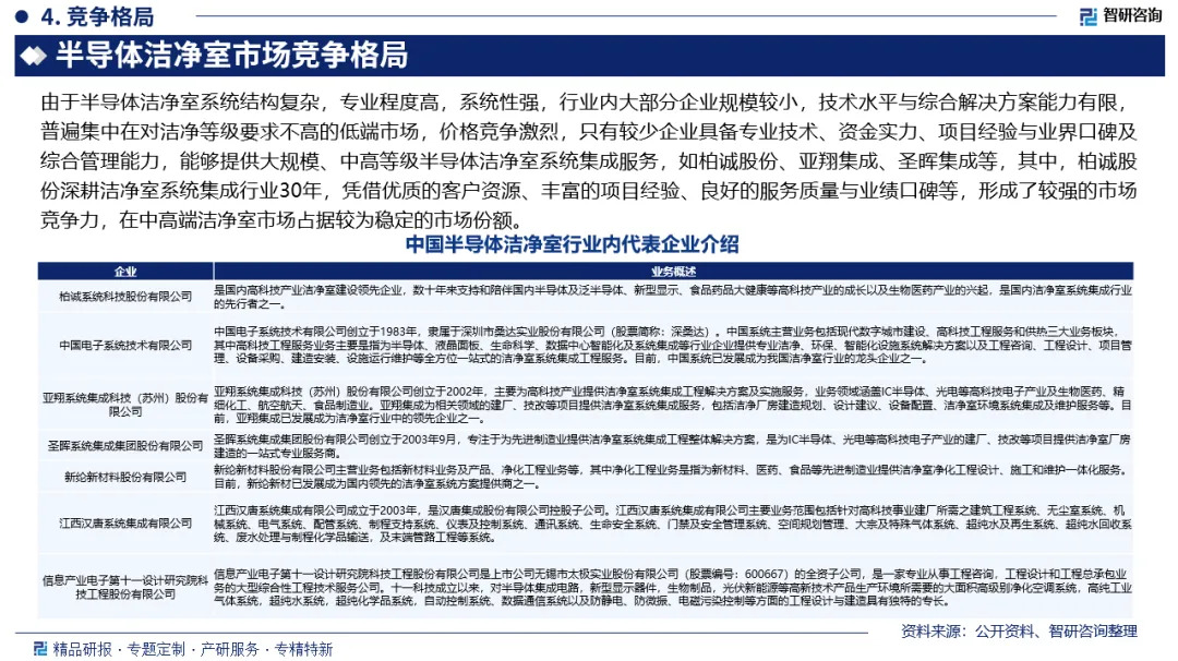 市场竞争格局:由于半导体洁净室系统结构复杂,专业程度高,系统性强,行业内大部分企业规模较小,技术水平与综合解决方案能力有限,普遍集中在对洁净等级要求不高的低端市场,价格竞争激烈,只有较少企业具备专业技术、资金实力、项目经验与业界口碑及综合管理能力,能够提供大规模、中高等级半导体洁净室系统集成服务,如柏诚股份、亚翔集成、圣晖集成等,其中,柏诚股份深耕洁净室系统集成行业30年,凭借优质的客户资源、丰富的项目经验、良好的服务质量与业绩口碑等,形成了较强的市场竞争力,在中高端洁净室市场占据较为稳定的市场份额。