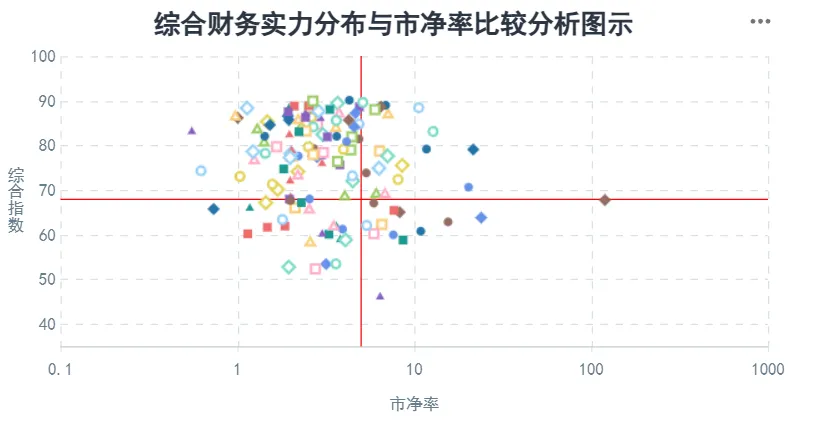 在公司的发展能力、经营稳定性及增长潜力的基础上,结合公司主营业务所属行业的分析、资产结构或资产质量分析、主营业务运营效率分析、受评主体的行业地位分析以及偿付能力的分析做出的公司综合财务实力分析判断。分数越高,公司的综合财务实力越强。处在右下区域的公司,市净率较高且相关指数较低,则存在公司综合财务实力不足的潜在风险。
