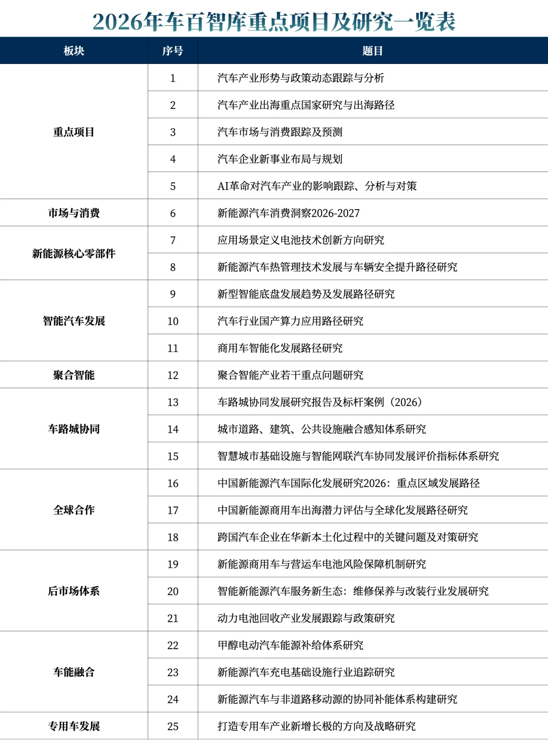 同时,面对2026年产业发展的新机遇与新挑战,车百智库重点项目及研究已正式启动,诚邀产业链各方企业、科研机构、政策部门携手合作,以研究为桥、以聚力为要,共同探索产业前沿议题,共筑汽车产业高质量发展。