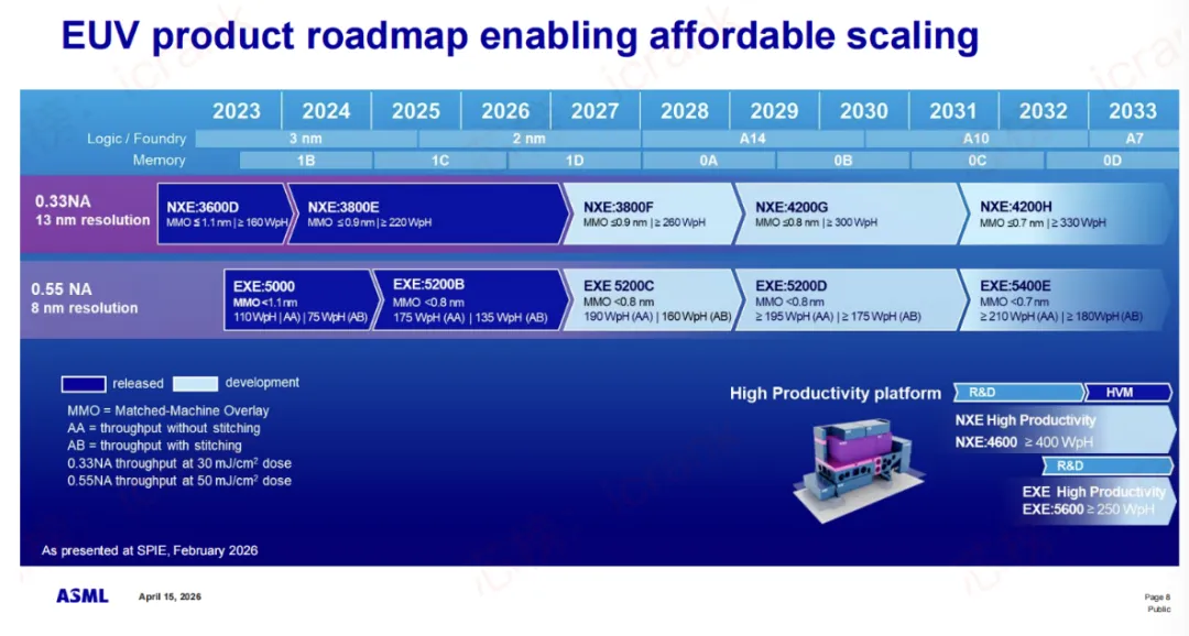 面对 AI 驱动的芯片需求爆发,ASML 同步更新了EUV 技术路线图,持续推进高数值孔径(High NA)EUV 研发,规划覆盖 3nm、2nm 直至 1nm 以下先进制程。NXE 系列迭代提速,NXE:3800F、NXE:4200G 等机型陆续落地,EXE:5200 系列进入研发攻坚阶段,目标实现 0.7nm 节点制程支撑,同时成功完成 1000 瓦 EUV 光源验证,为设备产能与效率提升奠定基础。