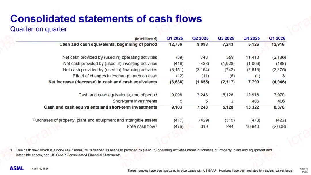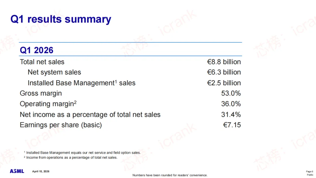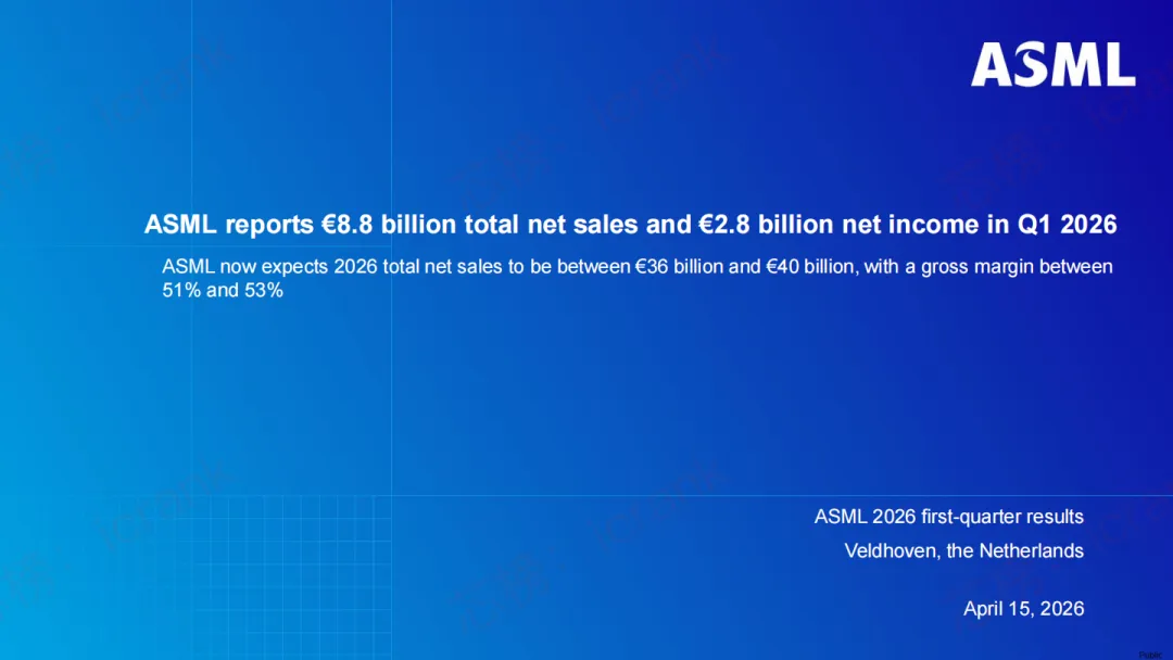 AI 算力浪潮席卷全球半导体产业,光刻机龙头 ASML 率先交出亮眼成绩单。2026 年 4 月 15 日,ASML 发布 2026 年第一季度财报,核心业绩稳超市场预期,同时披露最新 EUV 技术路线图与产能规划,上调全年业绩目标,尽显全球先进光刻市场的绝对主导地位。