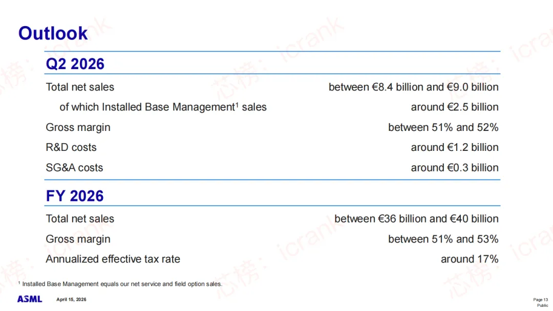 基于强劲的市场需求,ASML 大幅上调 2026 全年业绩预期,预计全年净销售额 360 亿 - 400 亿欧元,毛利率维持 51%-53%。第二季度预计营收 84 亿 - 90 亿欧元,毛利率 51%-52%,研发投入约 12 亿欧元,持续加码先进技术研发。