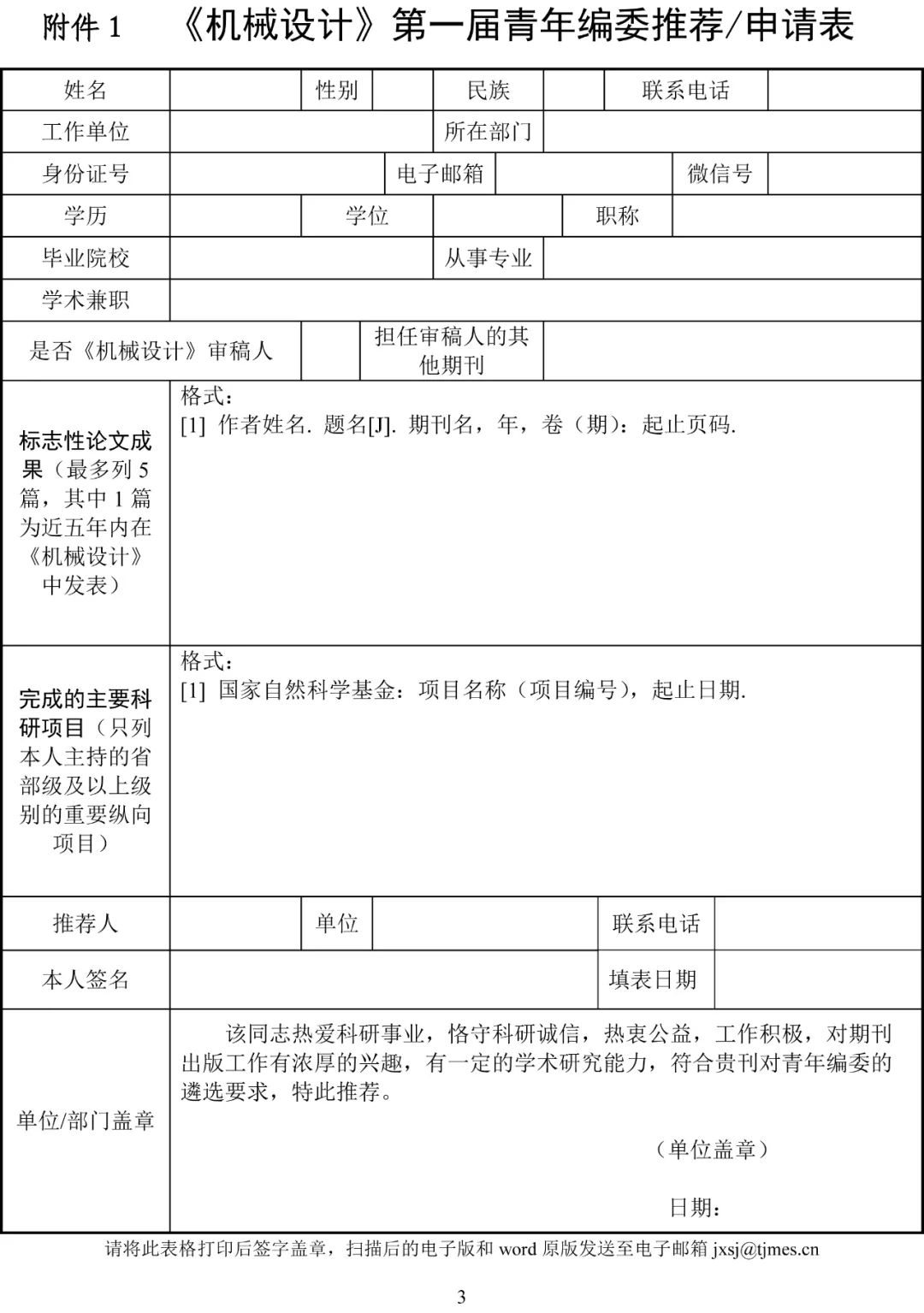 附件1:《机械设计》第一届青年编委推荐/申请表(点击下方原文链接下载或从https://tjmes.cn/?p=446 中下载)