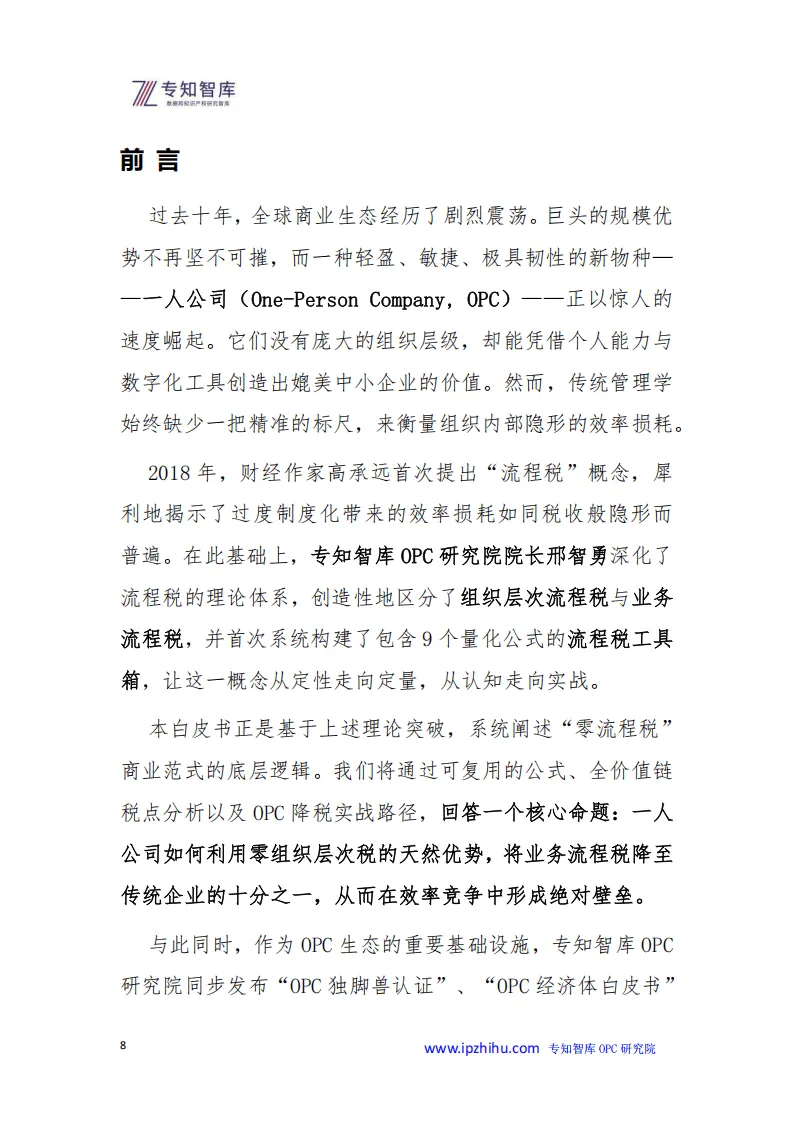 这份《2026年OPC一人公司崛起:零“流程税”时代的商业新范式》白皮书,核心围绕流程税展开理论构建与实战落地,系统阐释一人公司凭借零组织层次税的天然优势,成为新一代高效商业形态的底层逻辑。