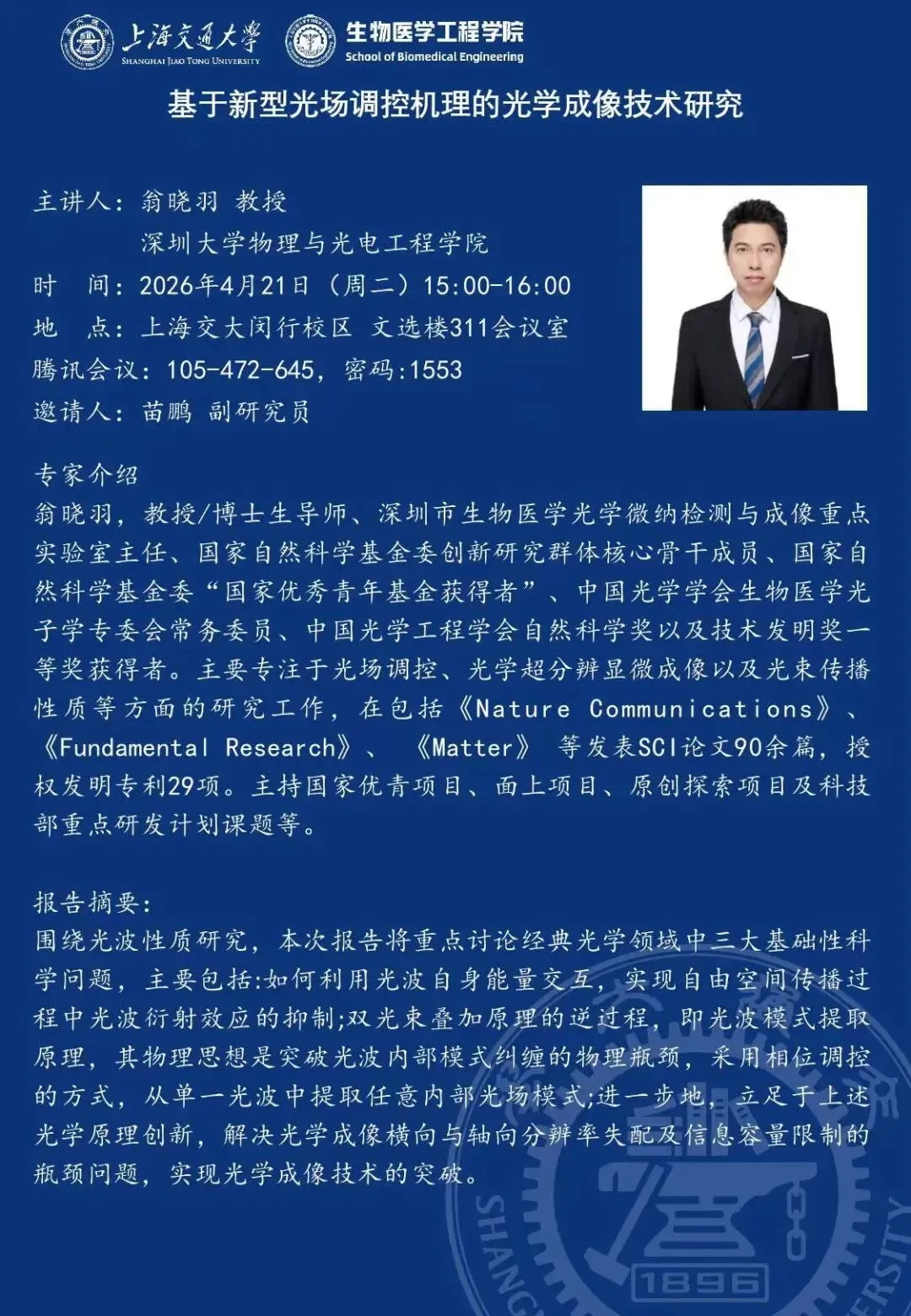 报告题目:基于新型光场调控机理的光学成像技术研究