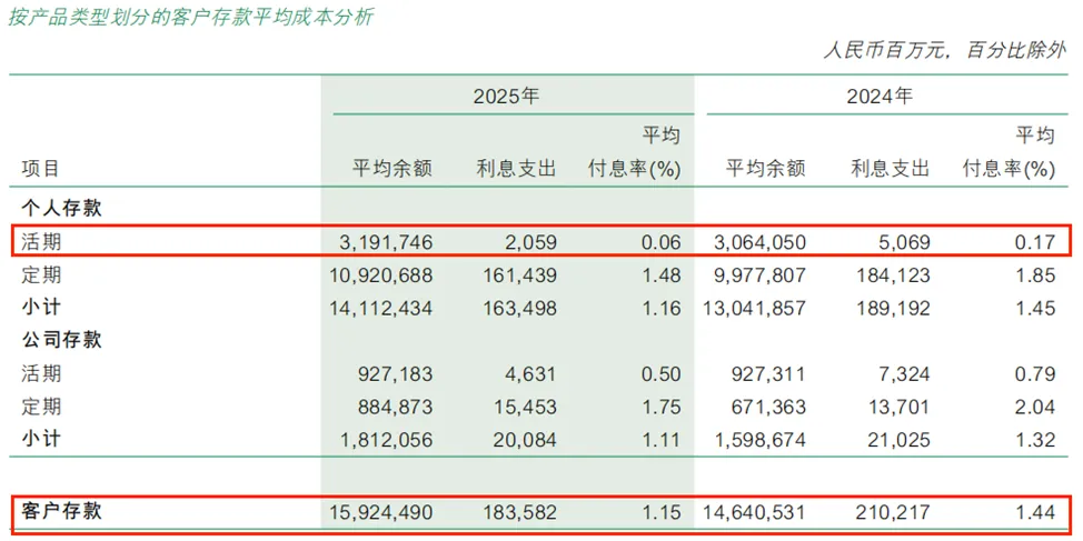 事实上,邮储银行负债端的结构性优势,构成了其盈利能力的坚实基底。该行通过超1.32亿张社保卡沉淀了超过3亿的中老年及县域客户,这部分客群具有显著的低风险偏好与高储蓄倾向,从而形成了极其稳固且低成本的个人核心存款。2025年末,其个人存款占比高达88.82%,活期存款平均付息率仅为0.06%,较2024年还下降了11个基点。