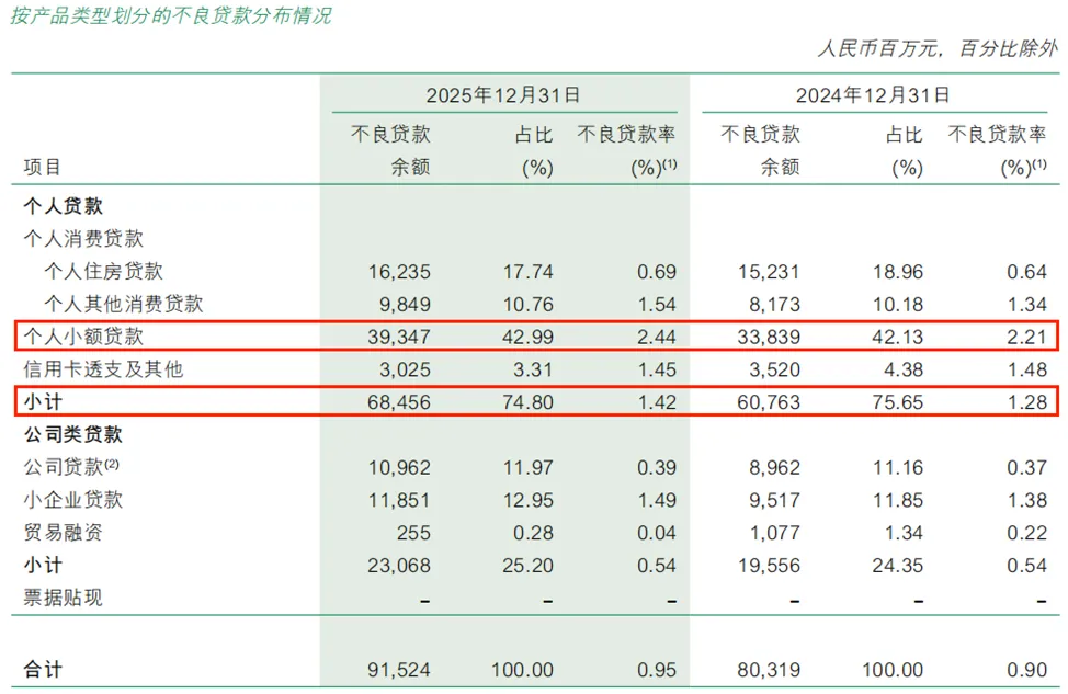而这些风险点正是主要集中在零售端。在经济周期压力下,居民还款能力受到冲击,零售贷款不良率普遍抬升,邮储银行也不例外。财报数据显示,2025年邮储银行个人贷款不良率升至1.42%,同比增长了0.14个百分点,其中个人小额贷款不良率最高,达到了2.44%,同比增加0.23个百分点。