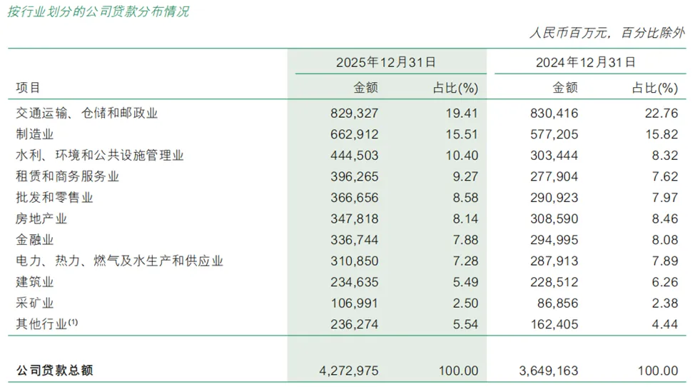 财报数据显示,2025年,邮储银行对公贷款余额突破4.27万亿元,同比增长17.09%,增速远超国有大行平均水平,占总贷款的比重提升至44.29%,新增贷款大量投向符合政策导向的制造业、水利环境、租赁商务、批发零售等领域;同时,报告期内还吸收对公存款1.85万亿元,增长11.50%,增速高于零售存款3.7个百分点,占总存款的比重也提升至11.16%。