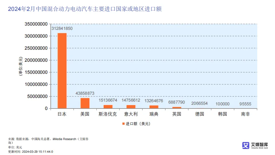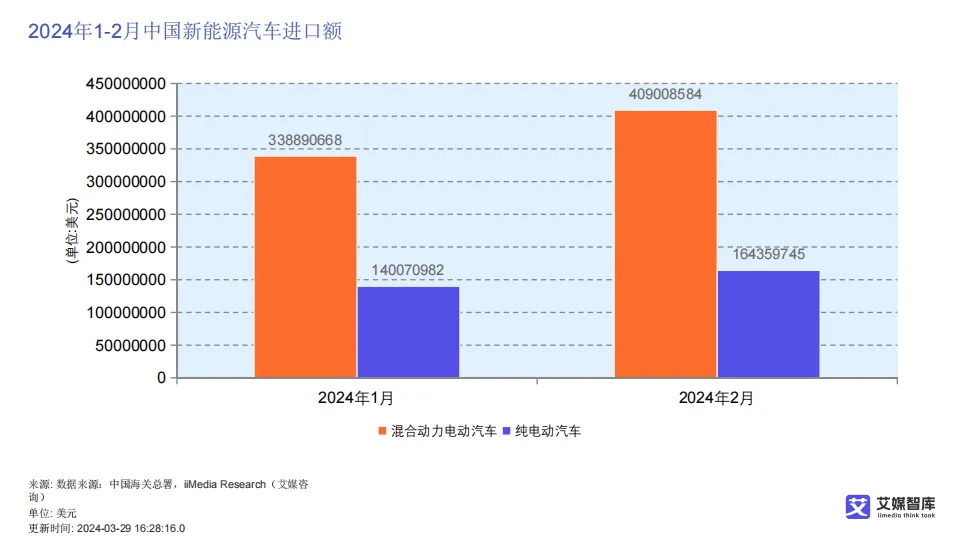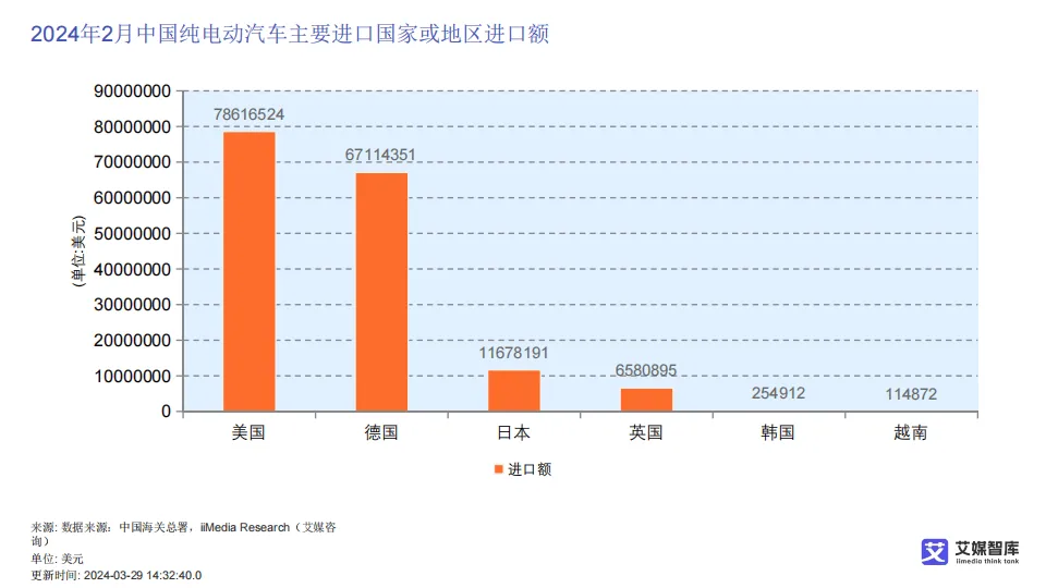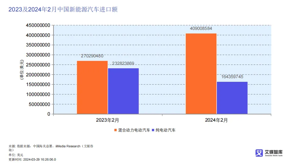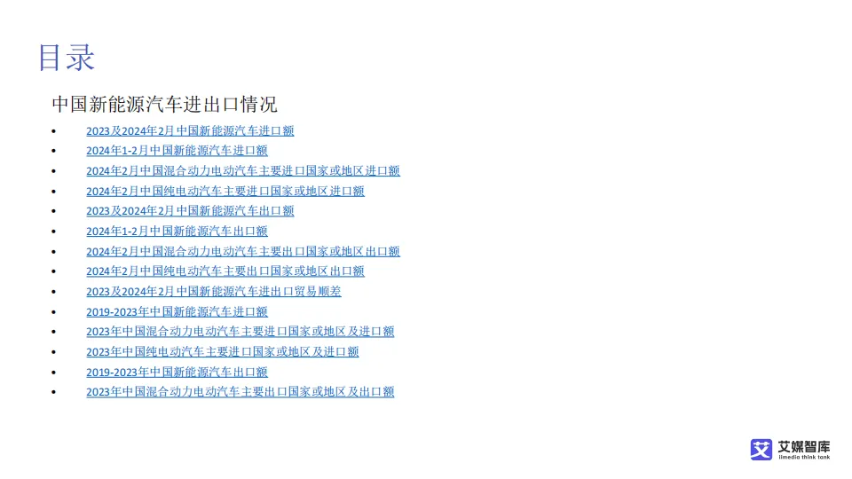 在进出口贸易方面,中国新能源汽车已形成稳固的贸易顺差,2017至2023年顺差规模持续扩大,2024年2月进出口数据进一步印证出口强势增长。出口以纯电动汽车与混合动力汽车为主,主要销往英国、韩国、比利时、巴西、美国等国家和地区;进口规模远低于出口,混合动力汽车主要从日本、美国进口,纯电动汽车进口来源集中于美国、德国等,整体呈现“出口主导、进口补充”的贸易结构。
