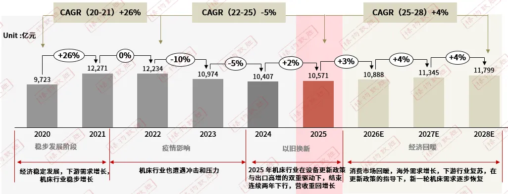 2025年机床工具行业实现营业收入10571亿元,同比增长2%,结束 2022-2024 年连续下滑态势,整体符合回暖预期。国家推出一系列政策扶持如设备以旧换新政策,缓解了行业下降,机床厂积极开拓海外市场,寻找新的增长点,部分抵消了国内市场的疲软,预计未来会有3%左右的增长。