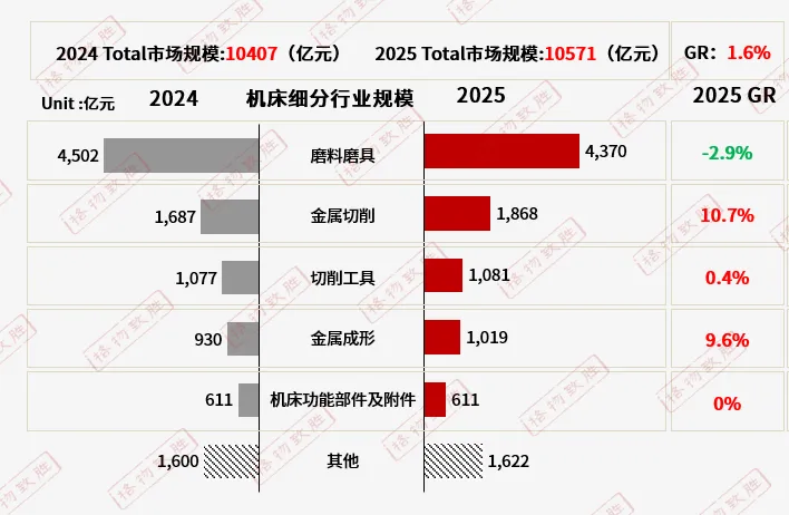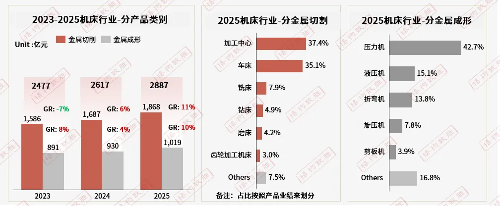 2025年机床行业整体规模达2887亿元,同比增长11%,延续高增态势。其中金属切削为核心增长引擎,规模1868亿元,增速11%;金属成形同步扩容,规模1019亿元,增速10%,两大品类实现协同增长,行业复苏动力强劲。