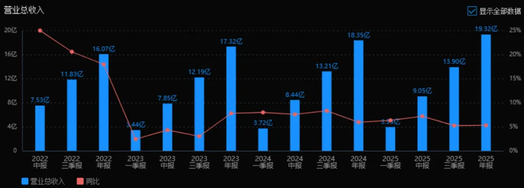 2025年的营业总收入为 19.32亿元,相较于2024年的18.35亿元增长了 5.30%。评价:公司收入保持稳定增长,但增速较2024年的5.94%略有放缓,整体仍处于温和扩张阶段。