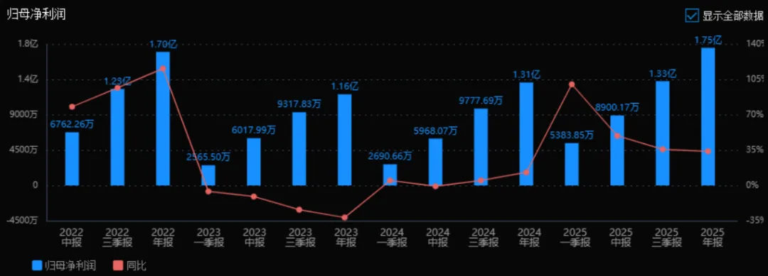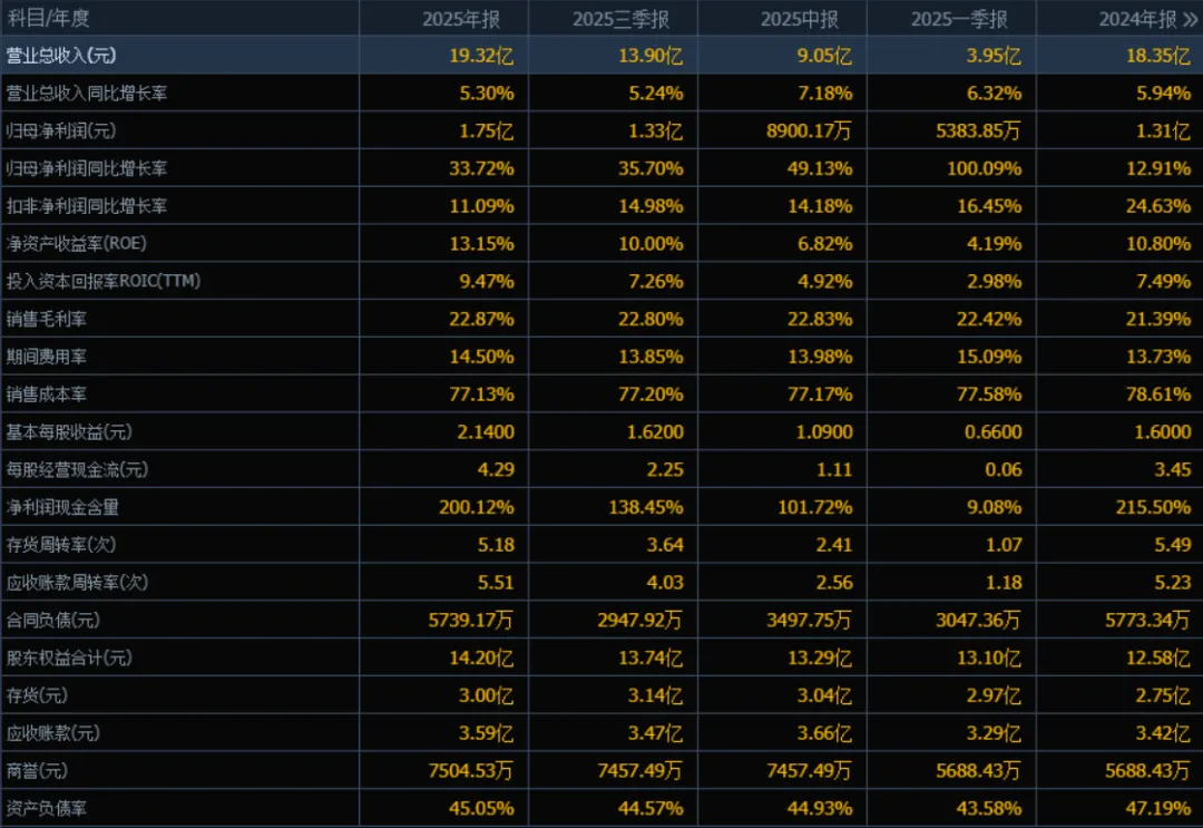 2025年的归母净利润为 1.75亿元,相较于2024年的1.31亿元增长了 33.72%。评价:净利润增速显著高于收入增速,显示公司盈利能力明显提升,可能与成本控制、产品结构优化或非经常性损益有关。