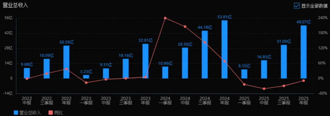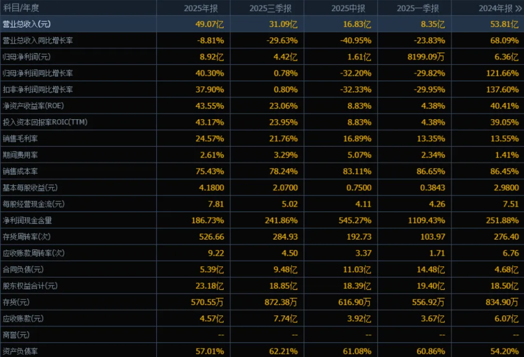 2025年营业总收入为49.07亿元,相较于2024年的53.81亿元,下降8.81%。评价: 收入出现小幅下滑,结束了2024年高增长(+68.09%)的态势,需关注市场需求或竞争环境变化。