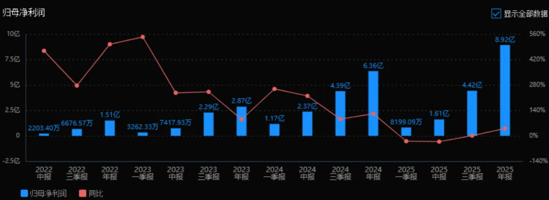 2025年归母净利润为8.92亿元,相较于2024年的6.36亿元,增长40.30%。评价: 在收入下滑的情况下,净利润实现大幅增长,表明公司盈利能力显著提升,可能得益于成本控制、毛利率改善或非经常性损益。