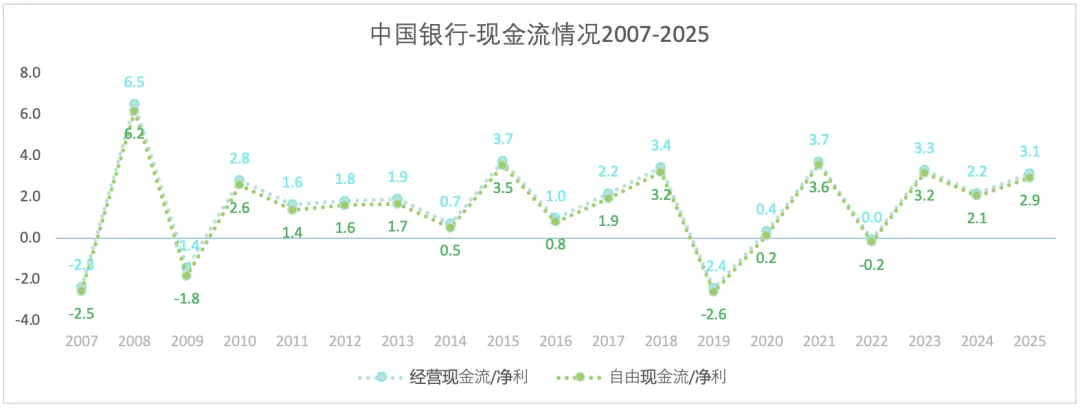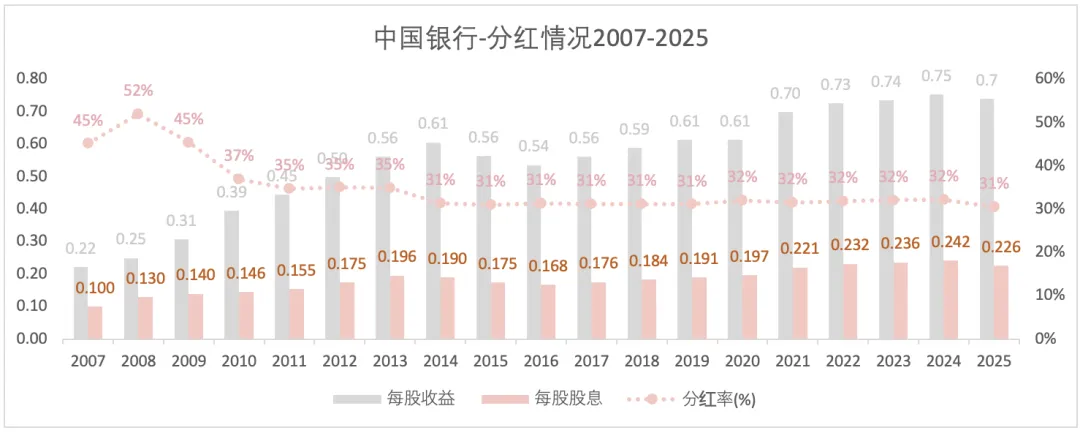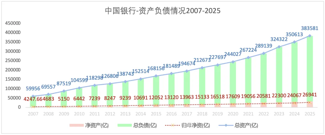 中国银行的总资产一直处于扩张中,归母净资跟随总资产保持了增长。2025年总资产和归母净资增长皆超过上一年,分别为9.4%和11.9%。2007-2025年总资产和归母净资的年复合增长率分别为10.9%和10.8%。