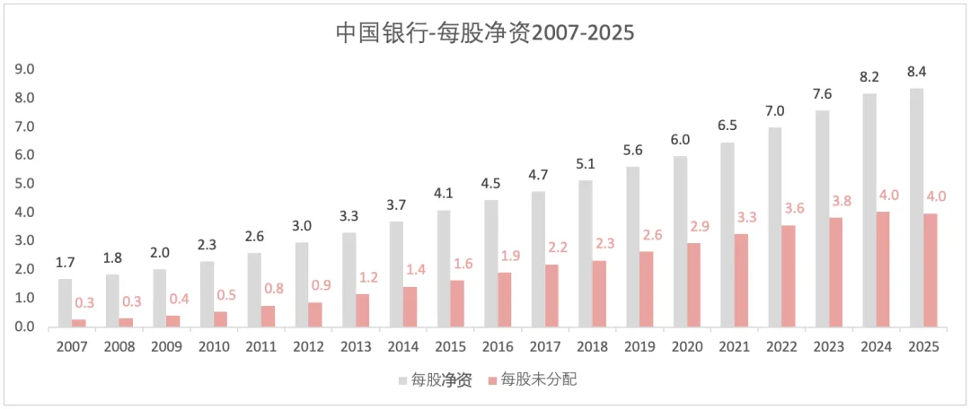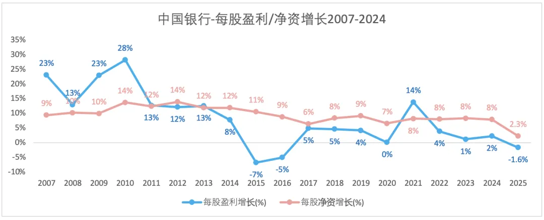 2007-2024,每股净资的复合增长率9.8%;2025年每股净资增长为2.3%。