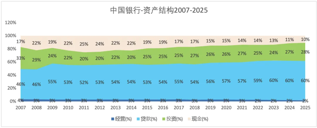 注: “现金”统计的是“现金、存放央行、存放同业、拆出资金”;“投资”包含了贵金属,长期股权投资,各种债务投资、各种金融资金等;“贷款”指“客户贷款及垫款”;“经营”资产指“固定资产、在建工程、土地使用权、无形资产、商誉”等。