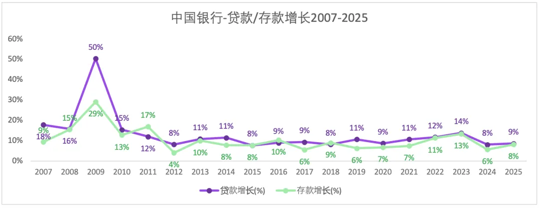 从2011年开始至2025年,存贷增长速度较为稳定,在一个区间内小幅波动。两者增速基本保持同步。