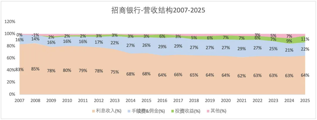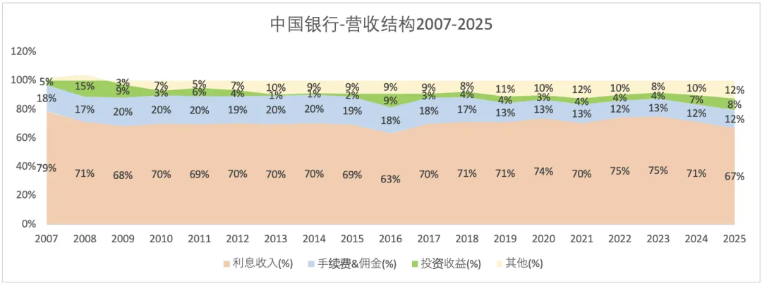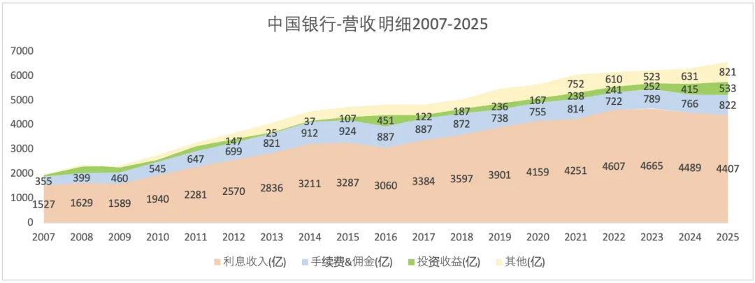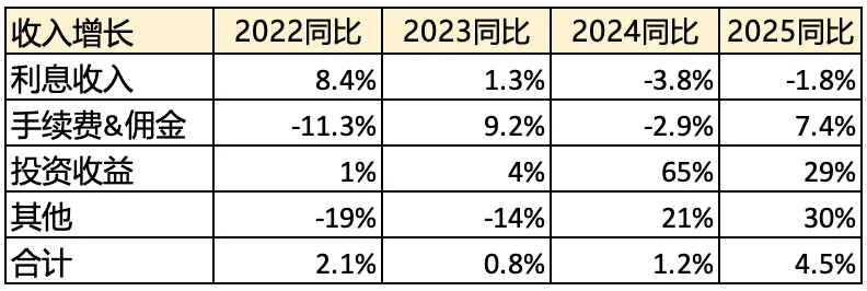 2025年总营收6583亿,同比增长45%。其中,利息收入4407亿(占比67%),同比下降1.8%;手续费&佣金收入822亿(占比12%),同比增长7.4%;投资收益533亿(占比12%),同比增长29%。