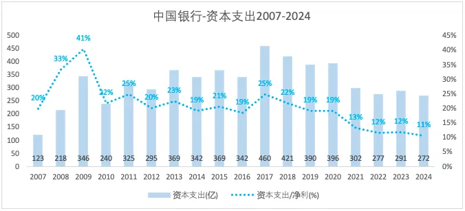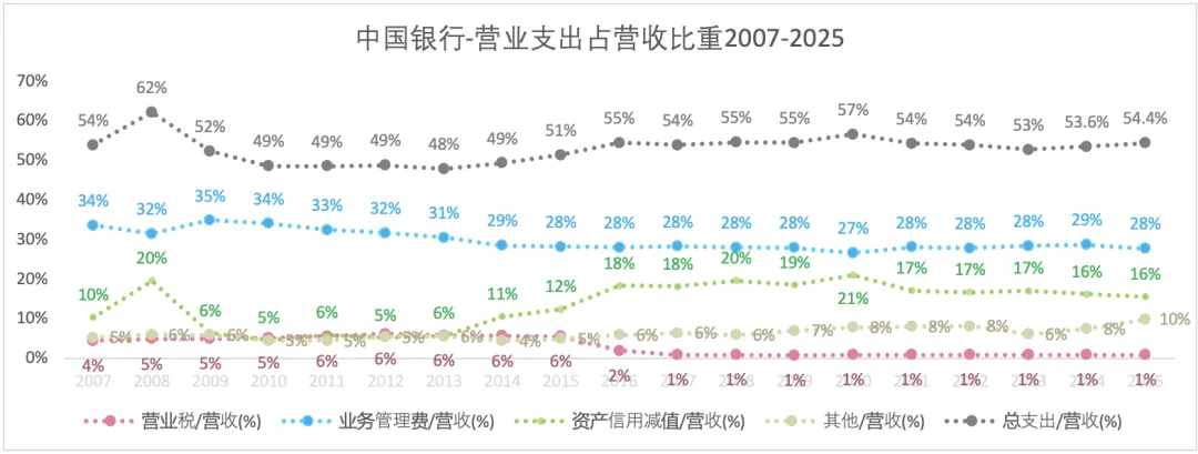 中国银行的营业总支出占营收的比重,在2016年之后基本稳定在54%上下;2025年比上一年增加了0.8个百分比。