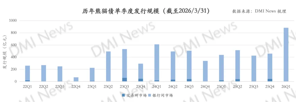 据DMI终端数据,2026年一季度,熊猫债市场继续扩容,共45笔新发规模合计882.35亿元;相较去年同期的24笔合计438亿元,发行笔数和发行量接近翻倍;并创下历史单季发行记录之最。此外,银行间市场仍是熊猫债的主要发行场所,除一笔交易所市场借新还旧外,其余均在银行间市场发行。