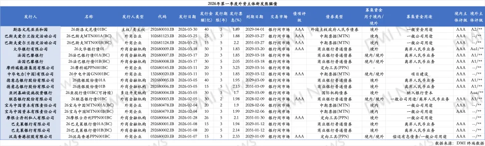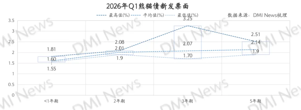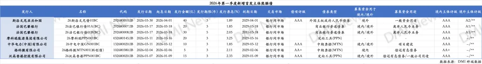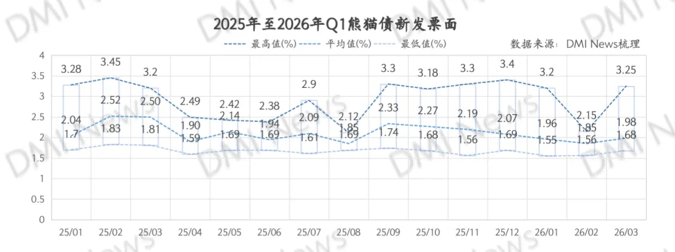 2026年一季度,熊猫债新发票面利率有所走低,但整体变化不大;与同期整体债市收益率先下后上的震荡走势趋同;其中2月大幅下行或受发行量较少影响,仅10笔熊猫债新发、合计204.25亿元。