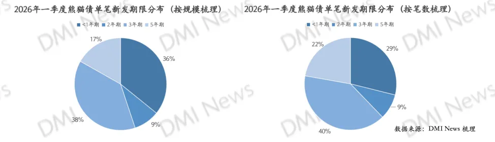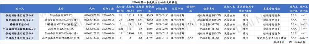 2026年第一季度,熊猫债新发期限主要集中在3年期品种,期内无5年期以上长期限品种发行。其中短期限品种占比较高、达38%,主要受蒙牛乳业大规模滚动发行超短融影响,其他短期限品种发行人还包括中集安瑞科和恒安国际,一季度共发行13笔、合计316亿元。