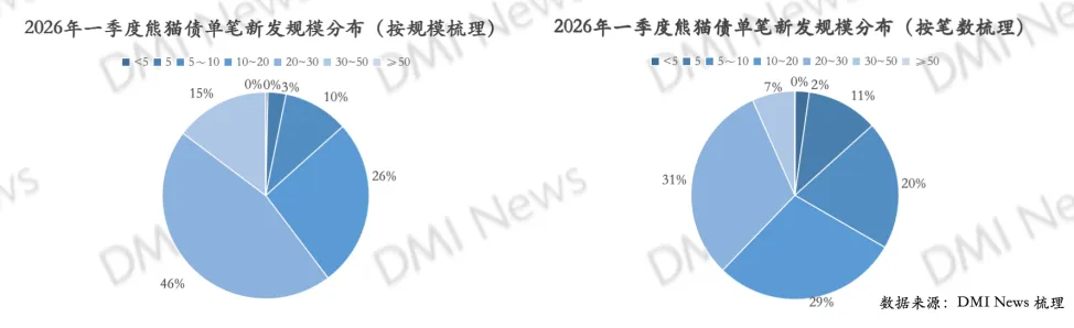 具体发行规模分布来看,据DMI终端数据,2026年一季度,国企发行人的熊猫债新发规模379亿元,占比约43%,主要得益于蒙牛乳业的261亿元发行;外企发行的熊猫债规模361亿元,占比约41%,与国企发行人发行量接近;此外,中资民企报告期内发行规模72.35亿元,占比8%。