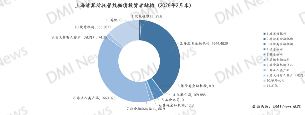 从持有人结构来看,广义基金、商业银行及境外机构目前仍然是配置熊猫债的主力。据上清所2026年2月末托管数据,期末熊猫债托管规模4,213.85亿元,较2025年末的3,767.8亿元增约11.8%。