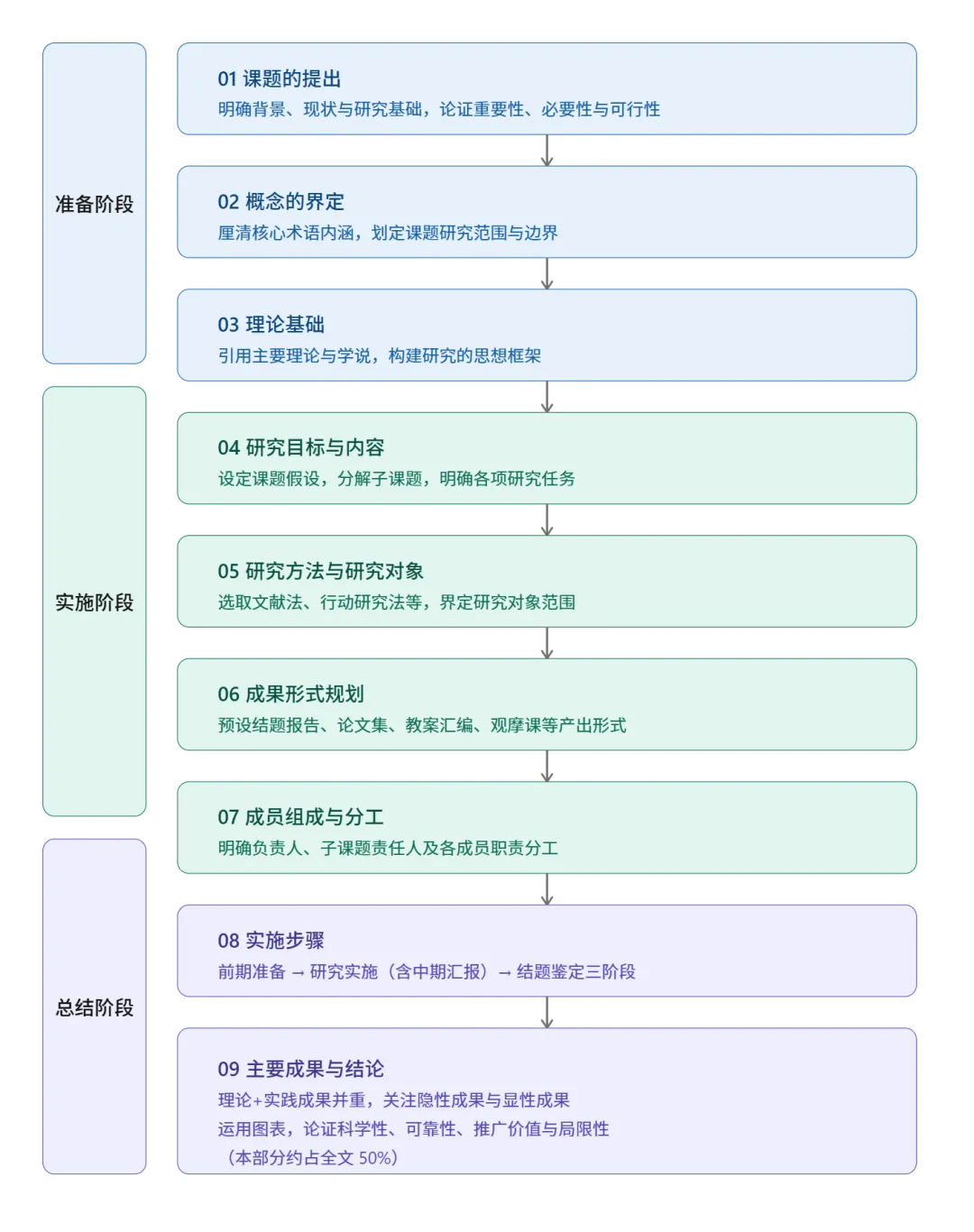 课题实施通常划分为三个阶段,各阶段任务明确,环环相扣: