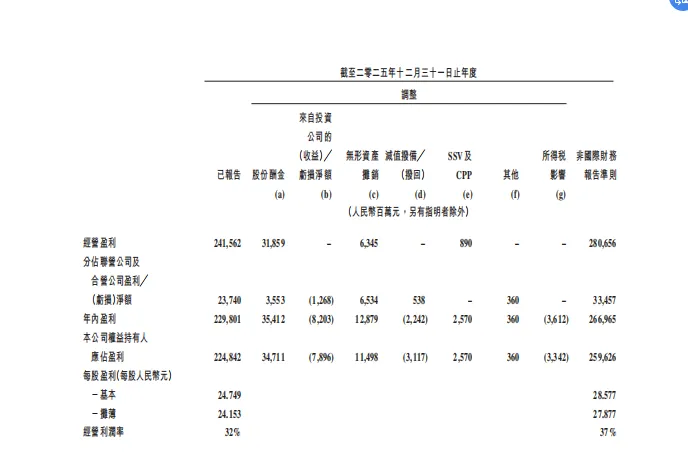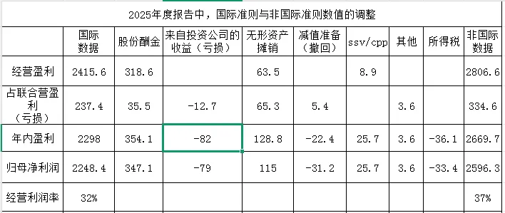 表中2025年的年内盈利的非国际准则数据,要在国际准则数据上加回354.1亿的股份酬金。