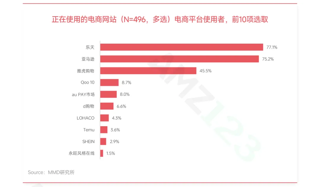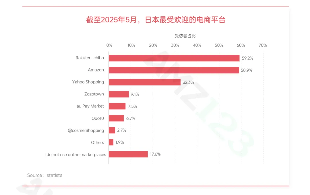 日本电商市场呈现明显的多平台格局,乐天与亚马逊日本站构成第一梯队,二者使用率不相上下,乐天凭借深厚的积分会员体系在客单价和用户黏性上占据优势,而亚马逊则依托高效的配送网络和Prime会员服务稳扎稳打。雅虎购物紧随其后,与PayPay数字钱包深度绑定,在价格敏感型消费者中形成较强吸引力。