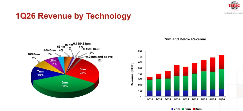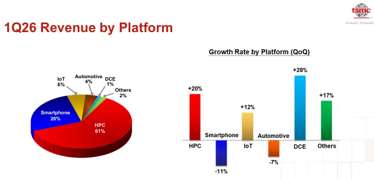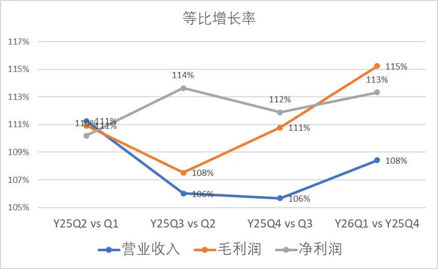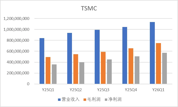 台积电发了2025年年报和26年一季度报。报告很长,摘选几个核心要点:- 2纳米技术已经具备量产能力。(Our 2-nanometer technology successfully entered high volume manufacturing in 4Q’25, with good yield, and we expect a fast ramp in 2026.)- 3D封装研发持续中。(lso developing advanced packaging and 3D chip stacking technologies, including CoWoS®, InFO, TSMC-SoIC® (System on Integrated Chips) and TSMC-COUPETM (Compact Universal Photonic Engine), to enable)- 继续高看AI需求。(cts the strong demand for AI to continue, while other non-AI markets are expected to be softer. The Company also anticipat)第一大客户25年需求是24年一倍多。看看季度营业收入,毛利润,净利润绝对值变化:毛利润率,净利润率连续上升,26年Q1的毛利润率继续增速扩大,而净利润率增速放缓,应该和扩大投资有关系。最后,TSMC表示,看好2026年,预估全年增长率30%,是不是保守了一些?