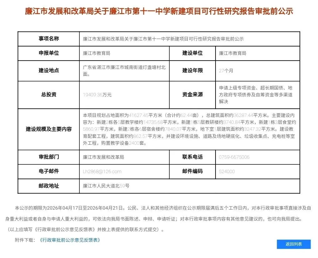 2026年4月17日,廉江市第十一中学新建项目可行性研究报告审批前公示。