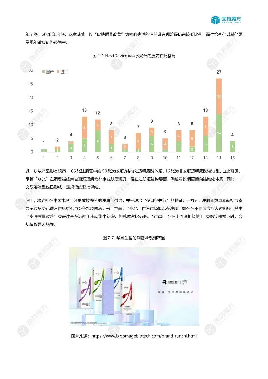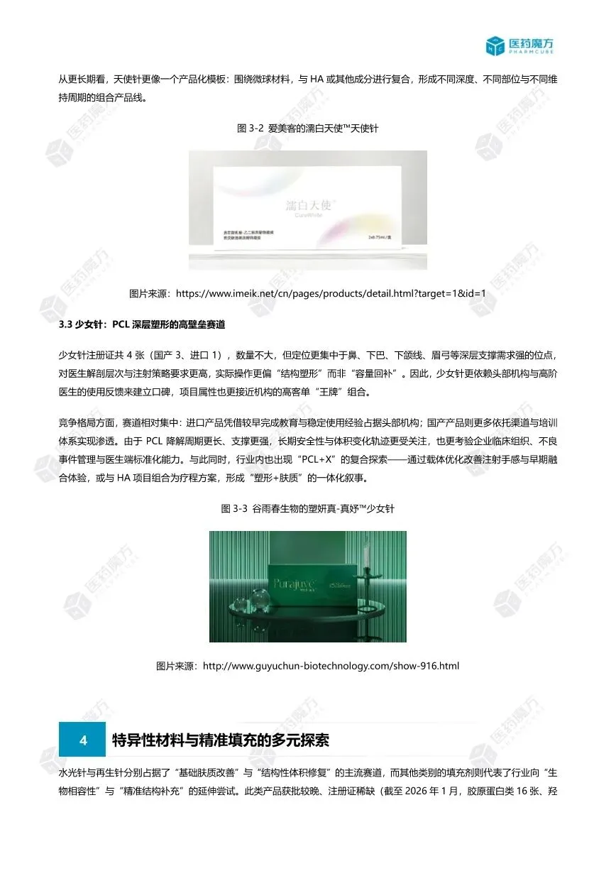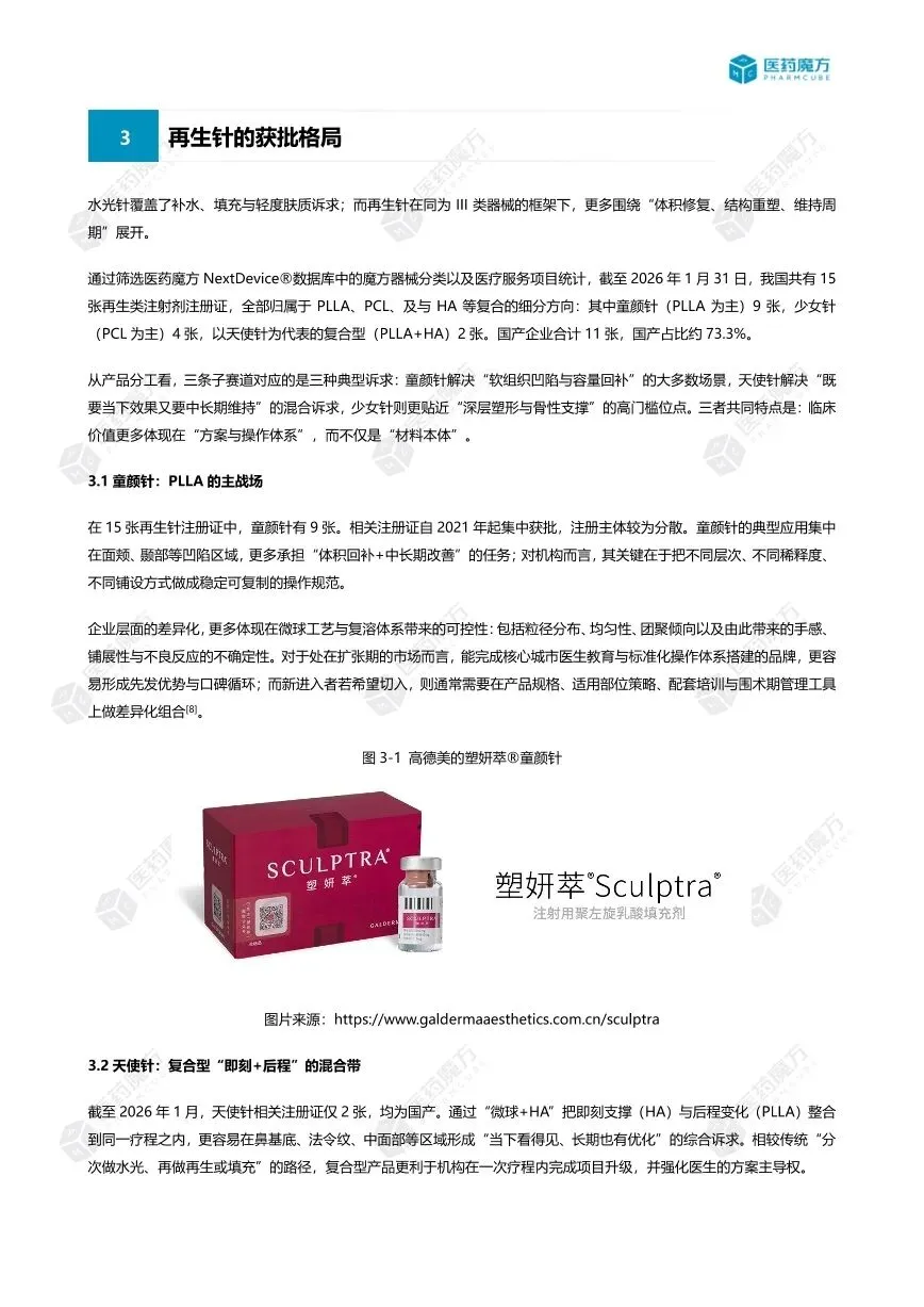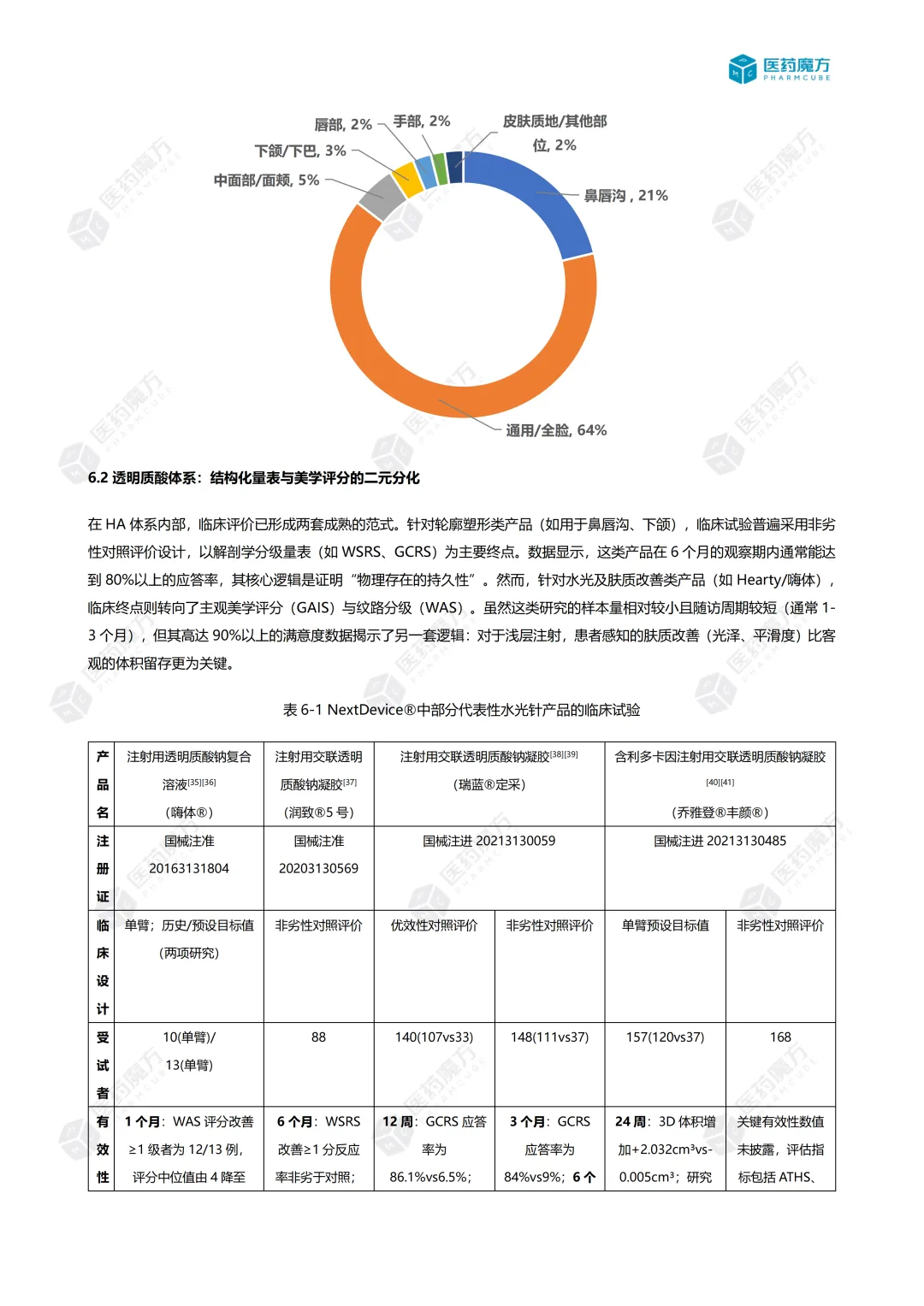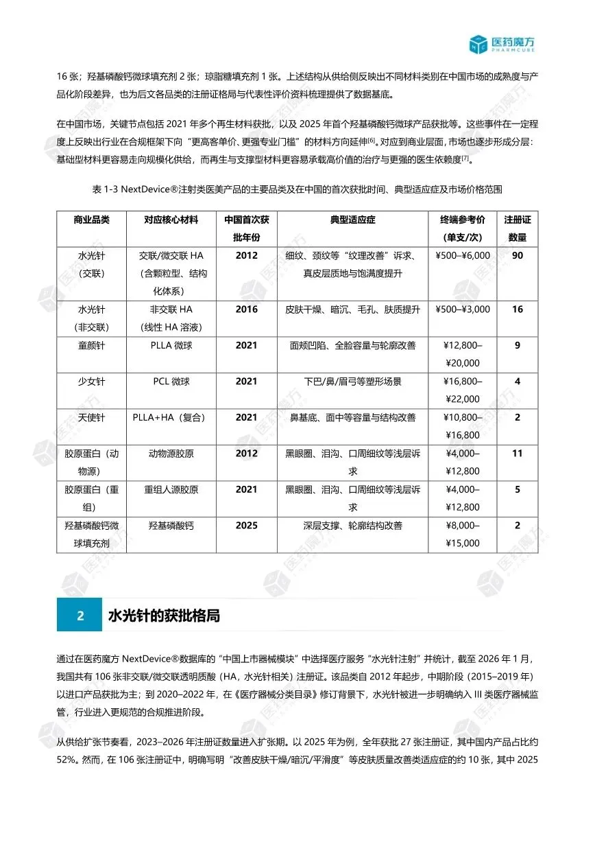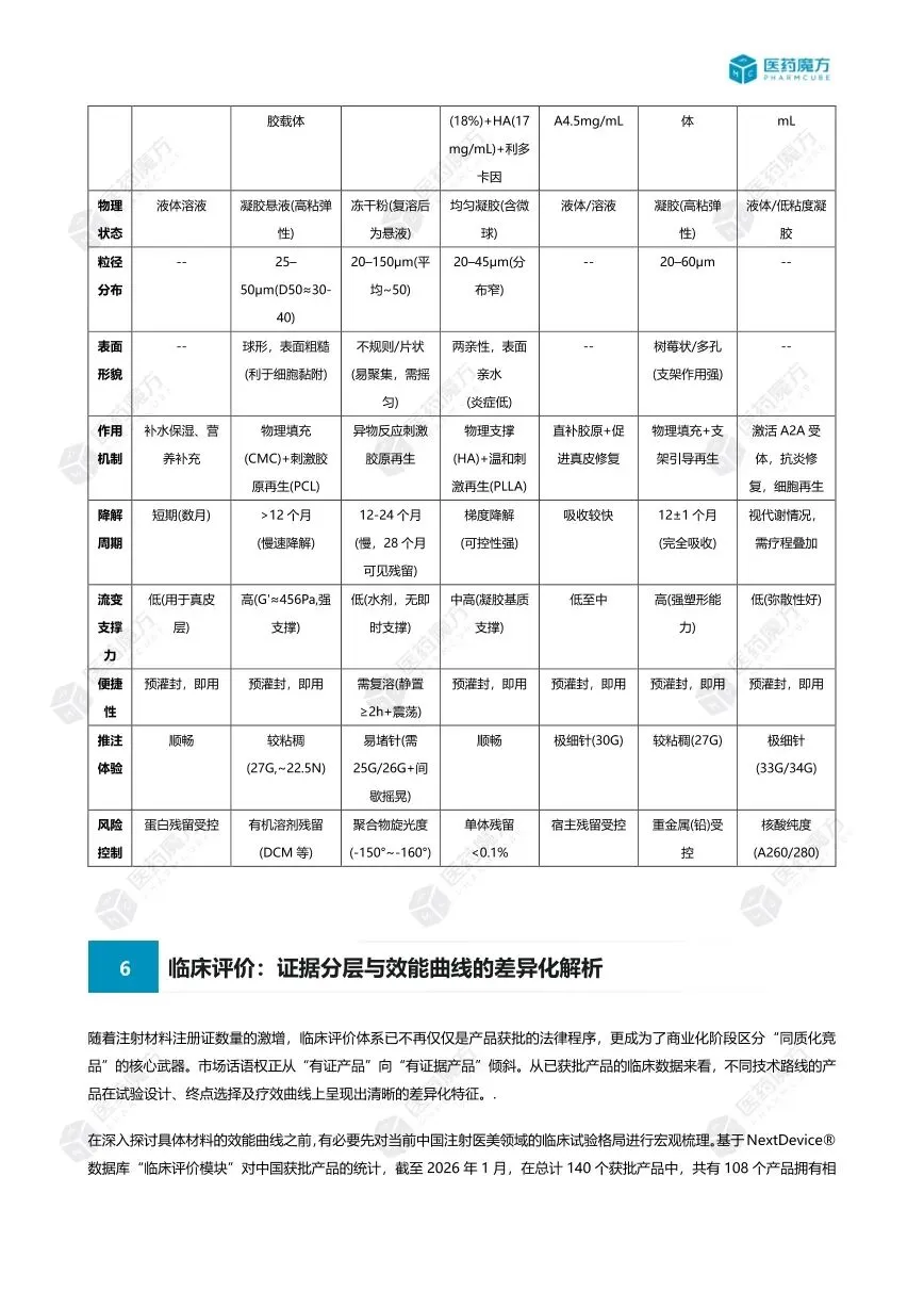 导读/Introduction 《从 “获证” 到 “循证”—— 中国注射医美材料的临床证据与竞争格局的深度演进》(2026 年 2 月)显示,中国注射医美行业正从 “有证即优” 转向循证竞争。截至 2026 年 1 月,国内注射医美注册证达 140 张,玻尿酸(水光针)占 106 张,再生材料(童颜针、少女针等)15 张,胶原蛋白 16 张,供给侧爆发使 “获证” 沦为基础门槛。市场核心竞争锚点转移,玻尿酸红海化,再生材料比拼起效与再生效果,PDRN 等探索组织学终点,临床证据成为市场 “二次审批” 关键。材料特性决定竞争路径:亲水 HA 率先上市但同质化严重;疏水再生材料(PLLA、PCL、CaHA)工艺与临床要求高,合规推进慢但差异化显著。未来行业将以高质量临床数据构建壁垒,驱动产品与市场格局深度重构。