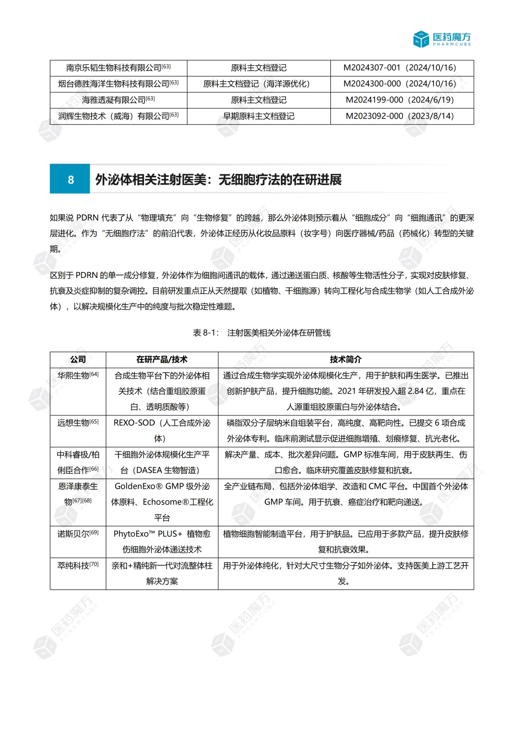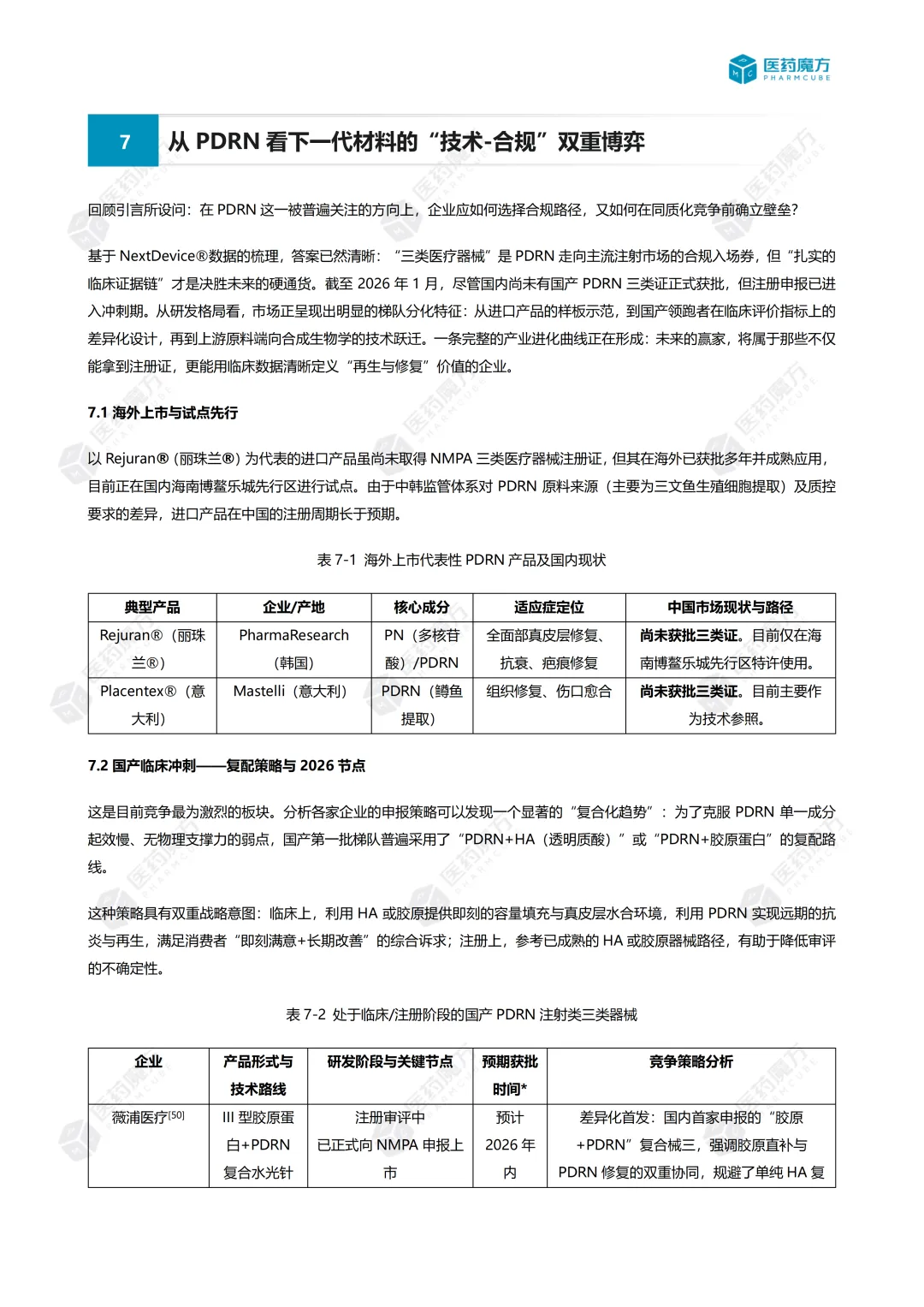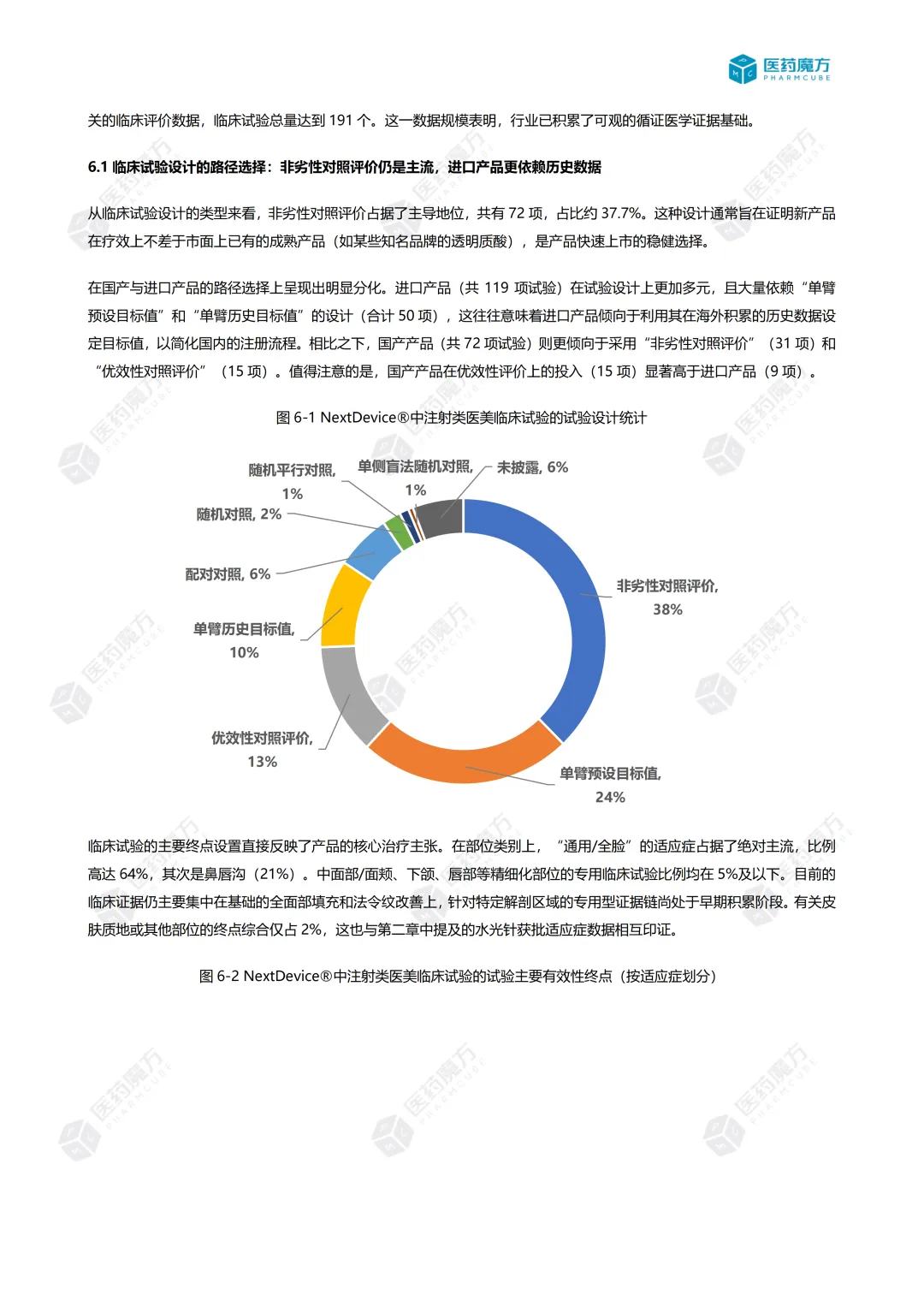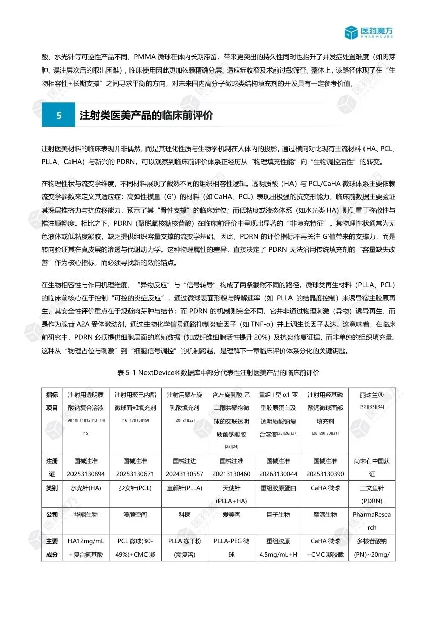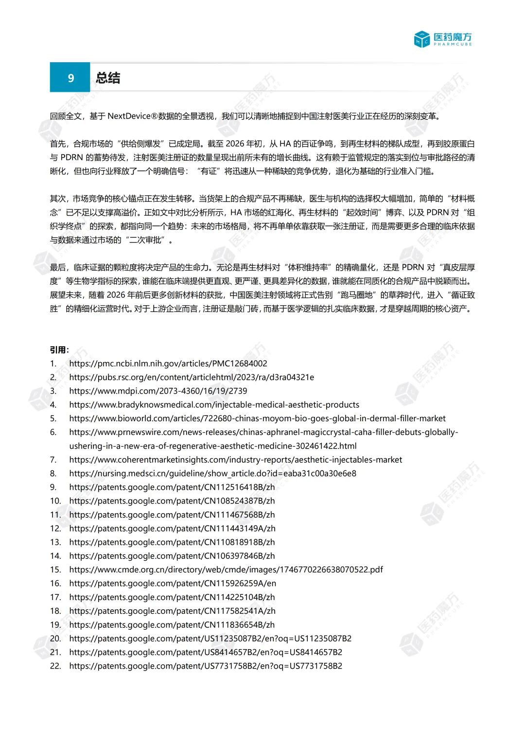 导读/Introduction 《从 “获证” 到 “循证”—— 中国注射医美材料的临床证据与竞争格局的深度演进》(2026 年 2 月)显示,中国注射医美行业正从 “有证即优” 转向循证竞争。截至 2026 年 1 月,国内注射医美注册证达 140 张,玻尿酸(水光针)占 106 张,再生材料(童颜针、少女针等)15 张,胶原蛋白 16 张,供给侧爆发使 “获证” 沦为基础门槛。市场核心竞争锚点转移,玻尿酸红海化,再生材料比拼起效与再生效果,PDRN 等探索组织学终点,临床证据成为市场 “二次审批” 关键。材料特性决定竞争路径:亲水 HA 率先上市但同质化严重;疏水再生材料(PLLA、PCL、CaHA)工艺与临床要求高,合规推进慢但差异化显著。未来行业将以高质量临床数据构建壁垒,驱动产品与市场格局深度重构。